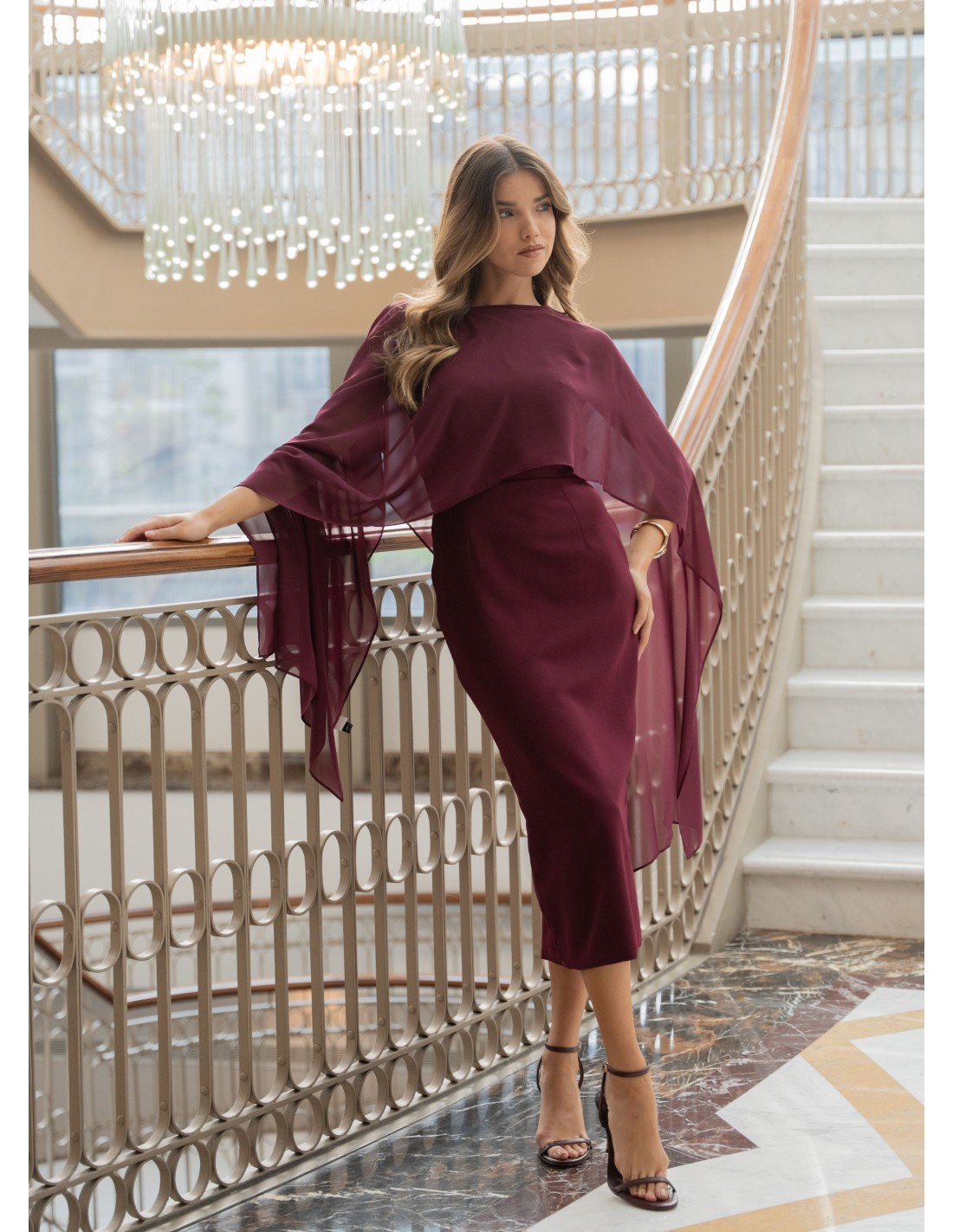 Vestido midi con escote asimétrico burdeos y capa de gasa