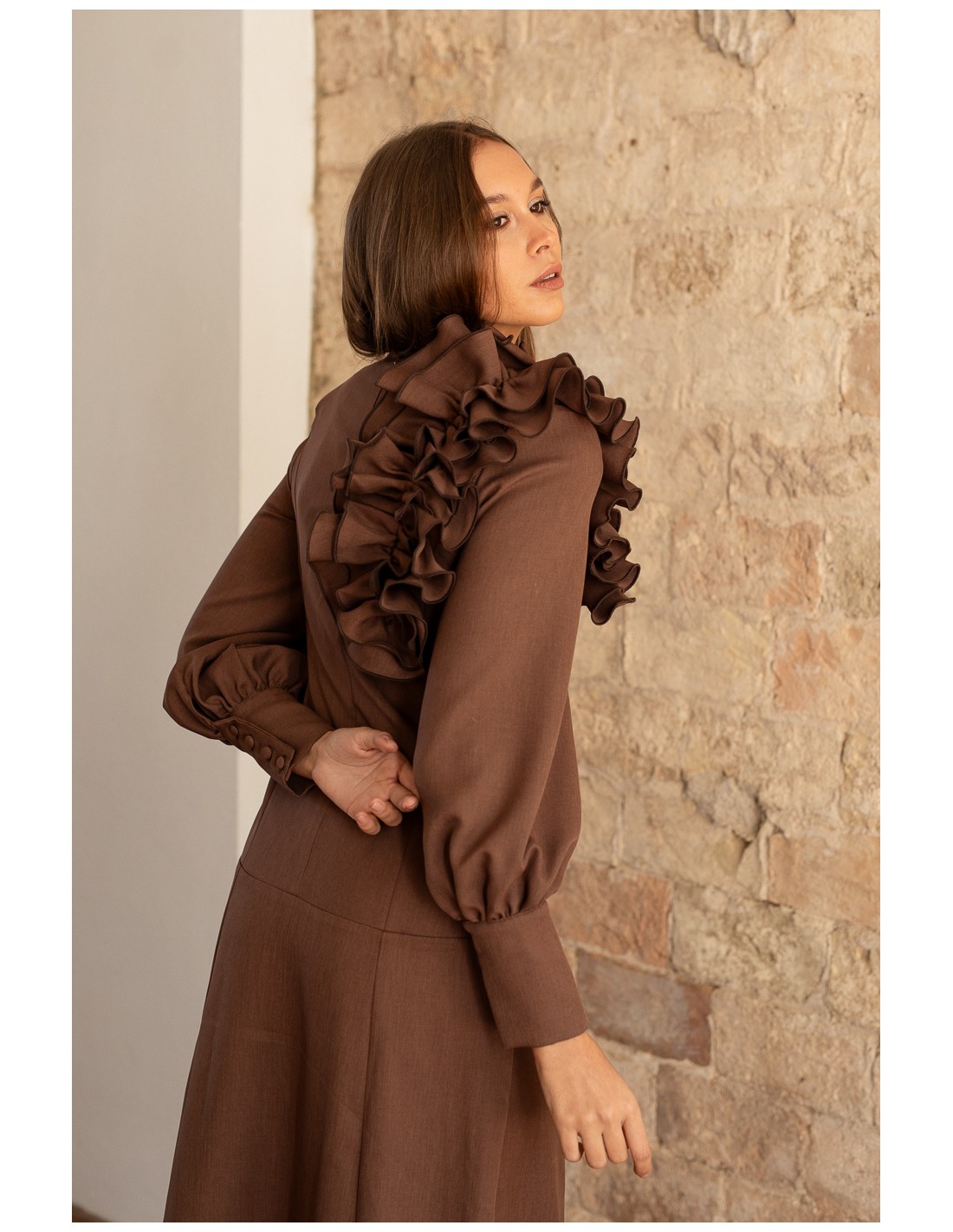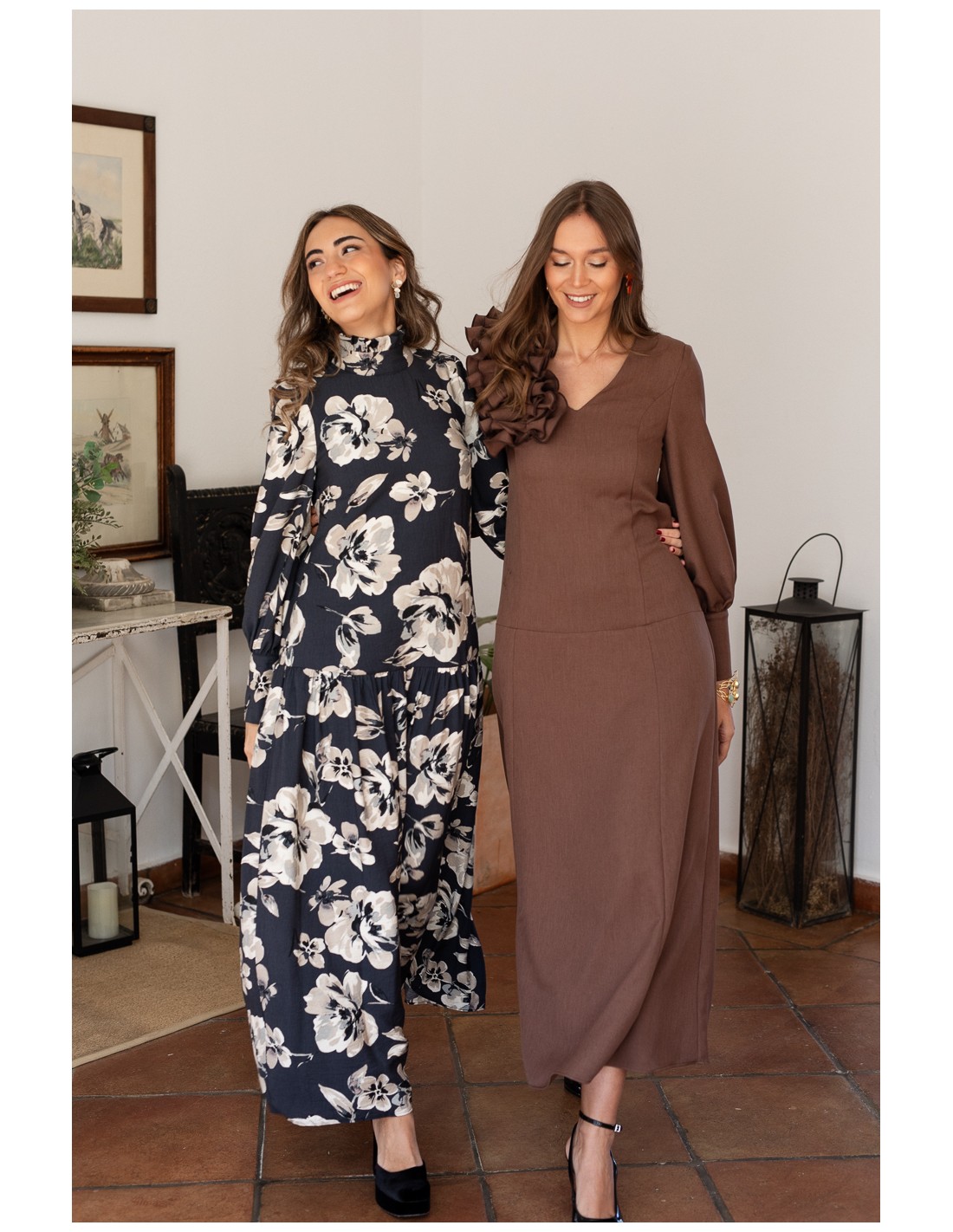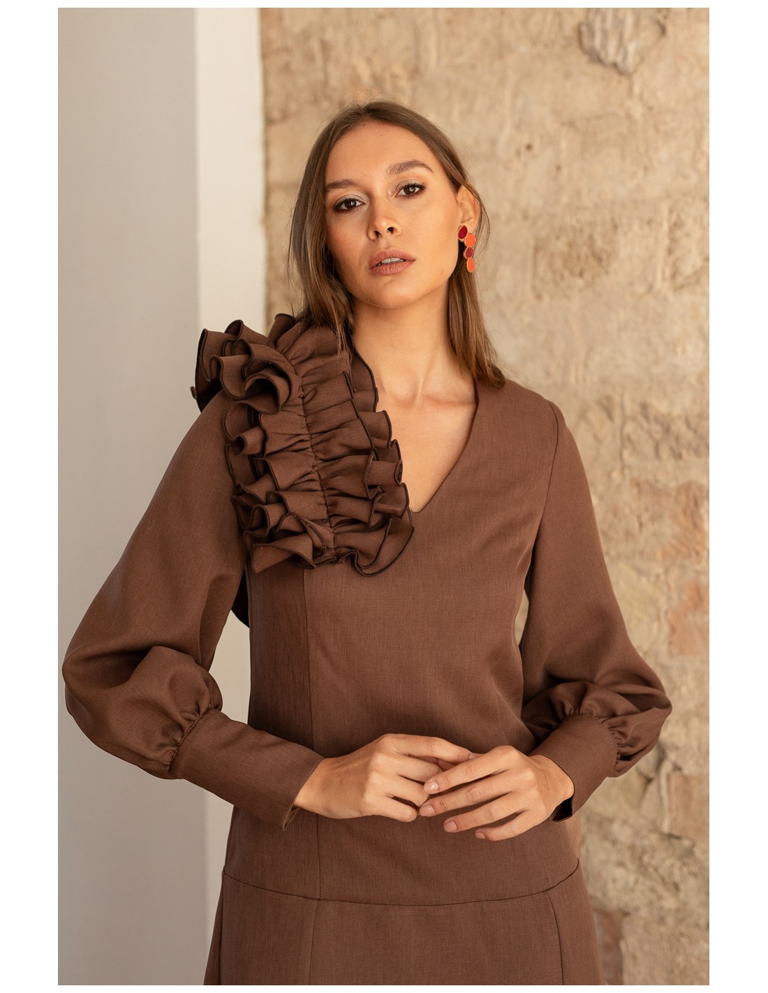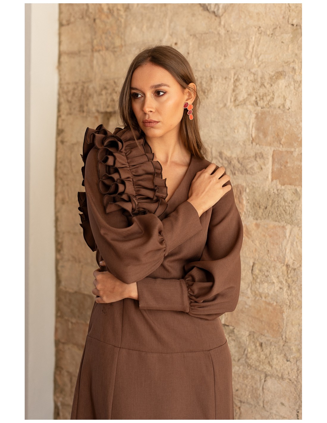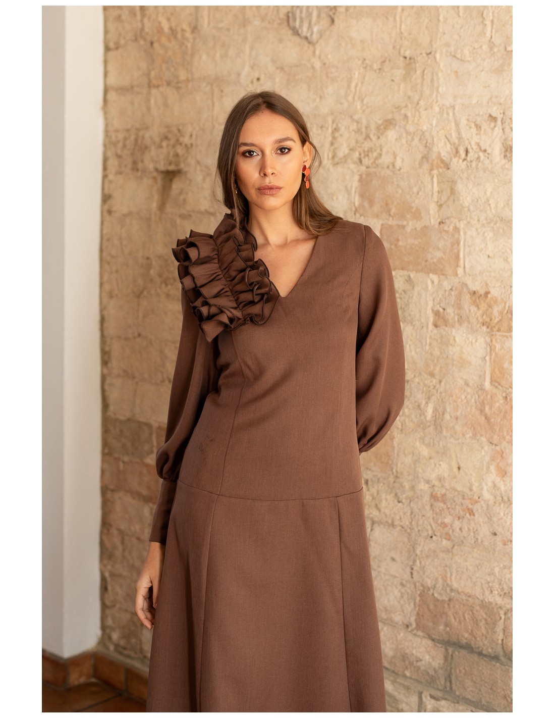 Vestido midi con volante marrón y manga larga para invitada de otoño e invierno