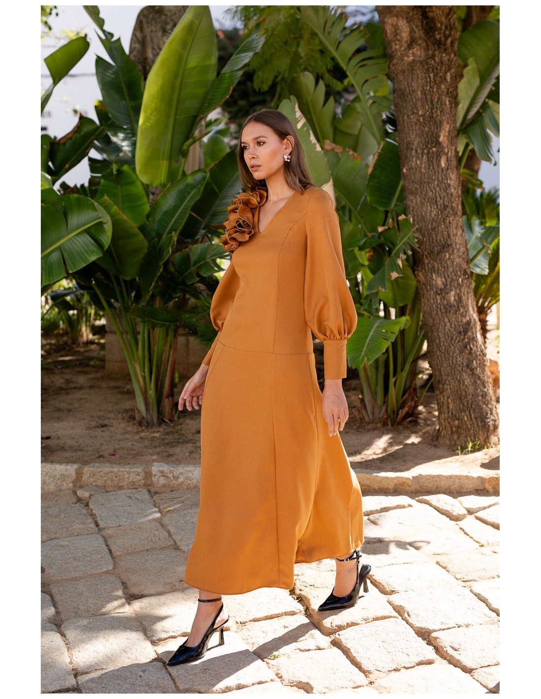 Vestido midi volante ocre y manga larga abullonada para ocasiones especiales