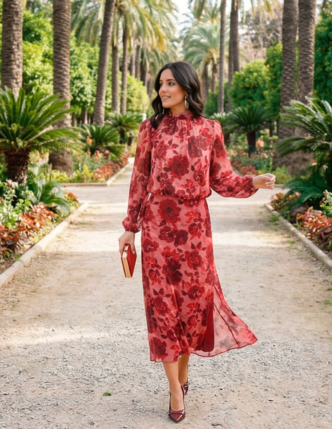 - Combínalo con accesorios en tonos dorado, nude o champagne para realzar la intensidad del rojo. Si buscas un estilismo más sofisticado, puedes optar por complementos en burdeos o granate. Peinados pulidos y sandalias sencillas ayudarán a equilibrar el impacto del estampado floral.