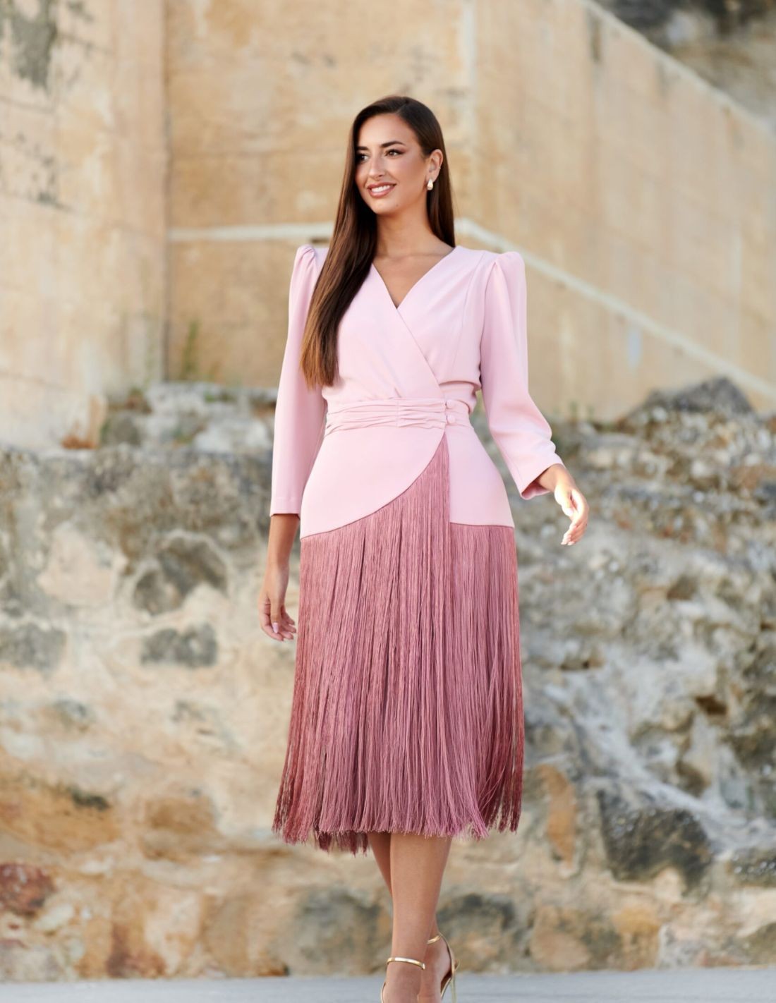 Vestido midi en crepé de alta calidad, presentado en un elegante color rosa maquillaje. Su falda incorpora un sofisticado fajín con flecos que aporta movimiento y personalidad, creando un diseño exclusivo.