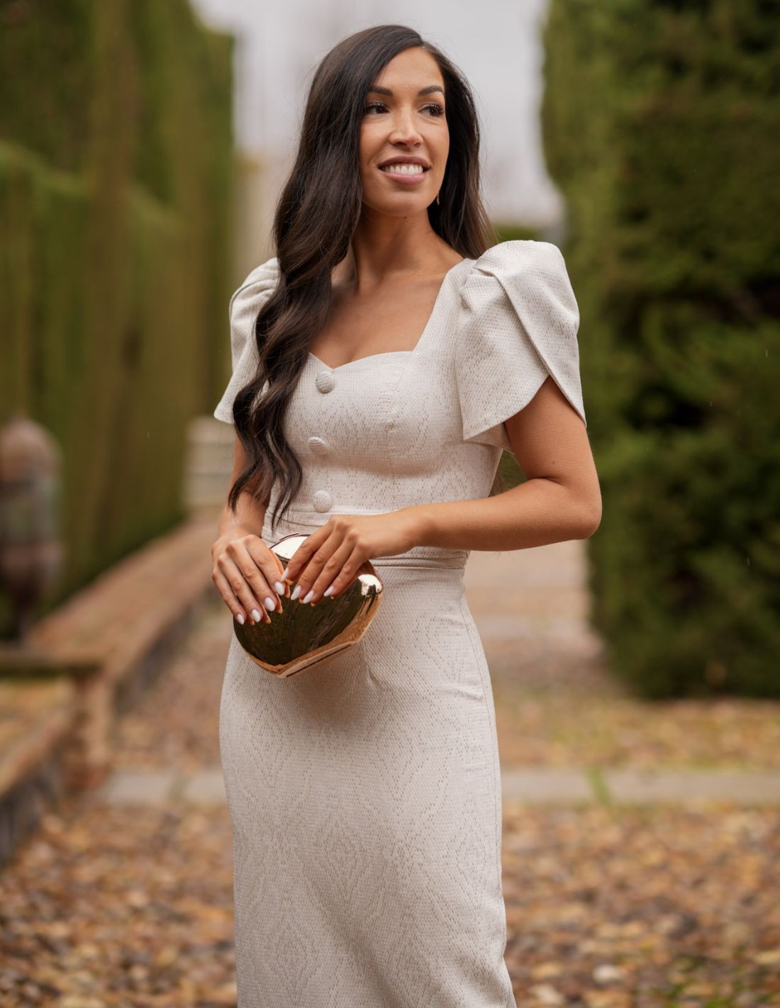Vestido midi elegante en brocado beige con detalles dorados, perfecto para ceremonias civiles, mamás de bautizo o comunión.