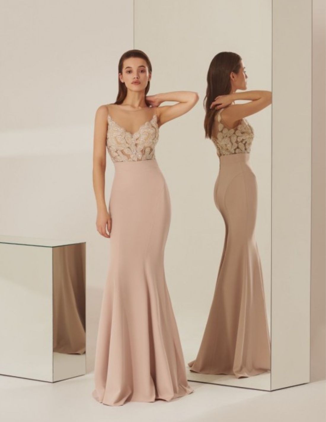 Este ideal vestido de invitada a boda se realiza en crepe rosa empolvado con cuerpo de encaje gris con brillo muy favorecedor. Su diseño presenta un escote en V con tirantes, transparencias con copas nude y falda larga corte sirena. Cierra en su espalda de malla nude con botones forrados y cremallera invisible.