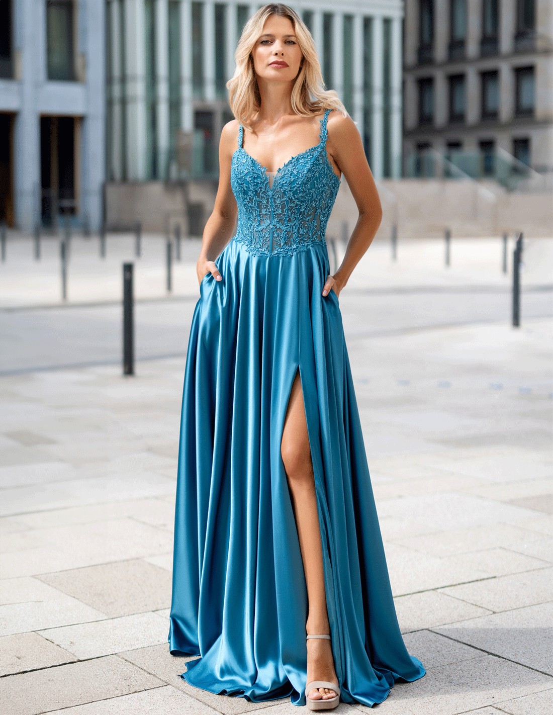 Brilla en cada ocasión especial con este vestido de invitada que combina elegancia, sensualidad y un diseño atemporal. Confeccionado en satén fluido y corpiño de encaje bordado, este Vestido de fiesta largo es ideal para bodas de tarde o de noche, galas o cualquier evento en el que quieras destacar.
