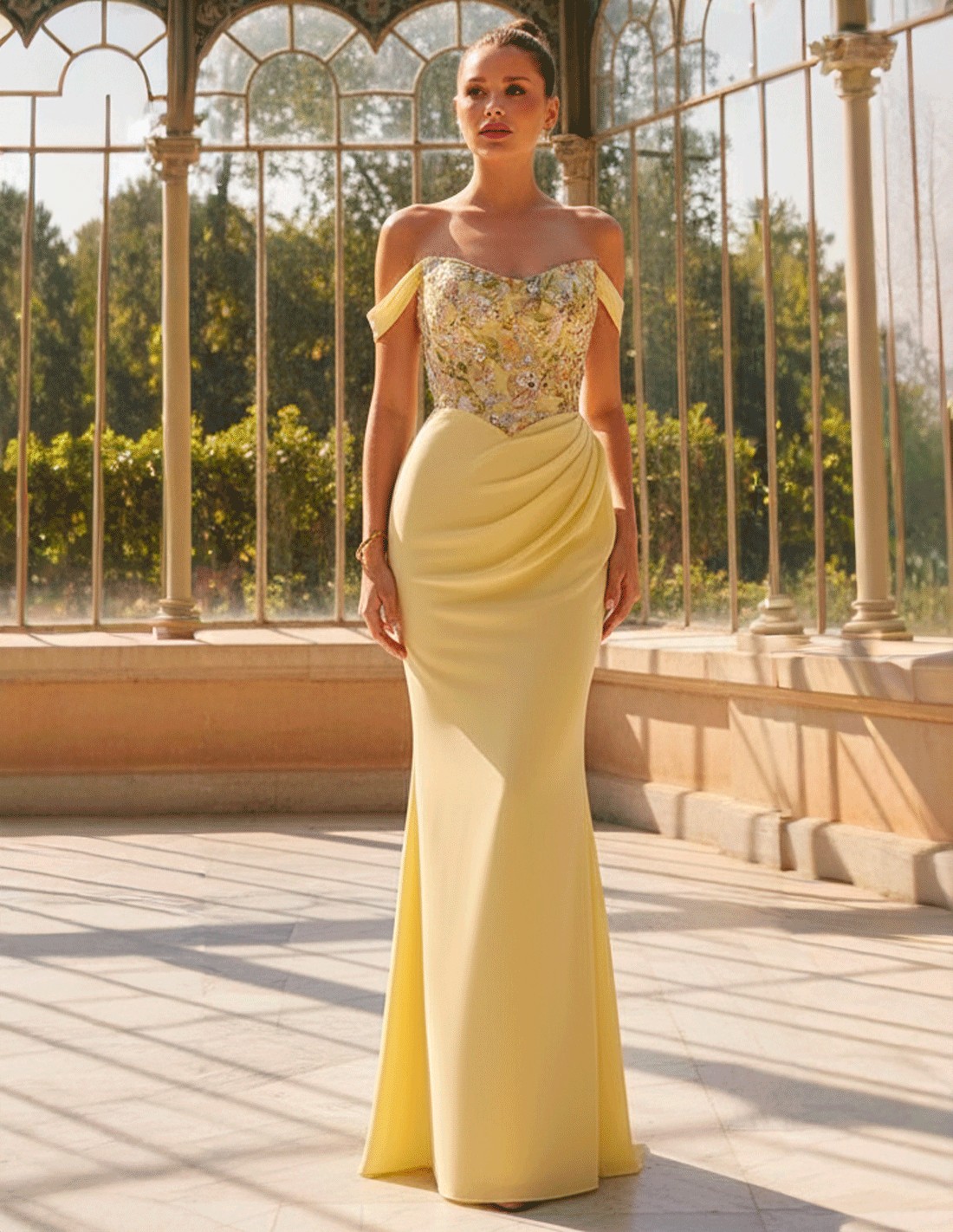 Este Vestido de fiesta largo con escote Bardot está diseñado para invitadas que buscan una presencia elegante, sofisticada y memorable en eventos especiales. Su silueta sirena ajustada realza la figura de forma armoniosa, mientras que los detalles delicados aportan un aire romántico y atemporal.