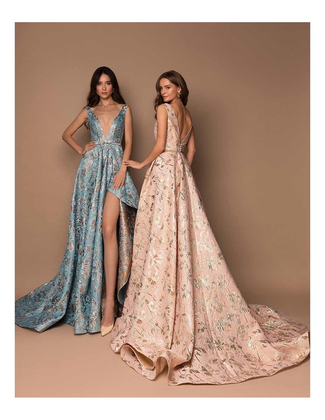 Vestido de fiesta largo realizado en tela jacquard con escote en pico y falda con volumen.