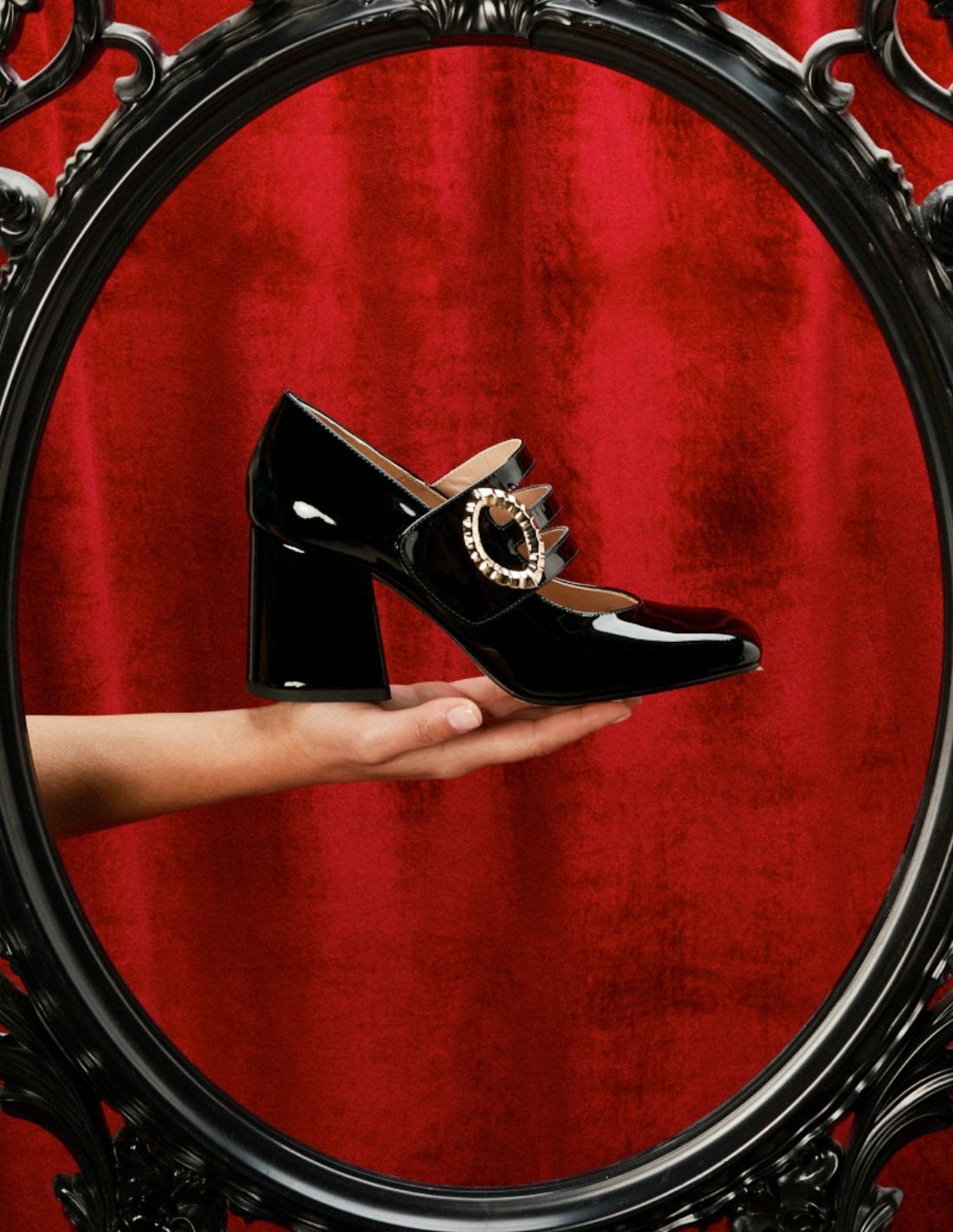 Zapatos de salón charol negro con hebilla dorada para ocasiones especiales.