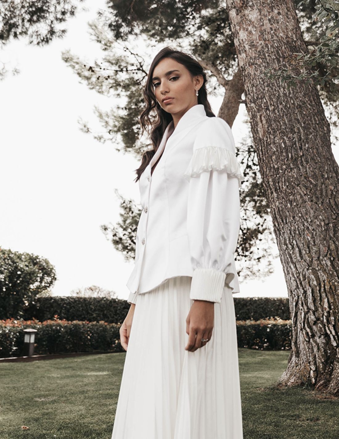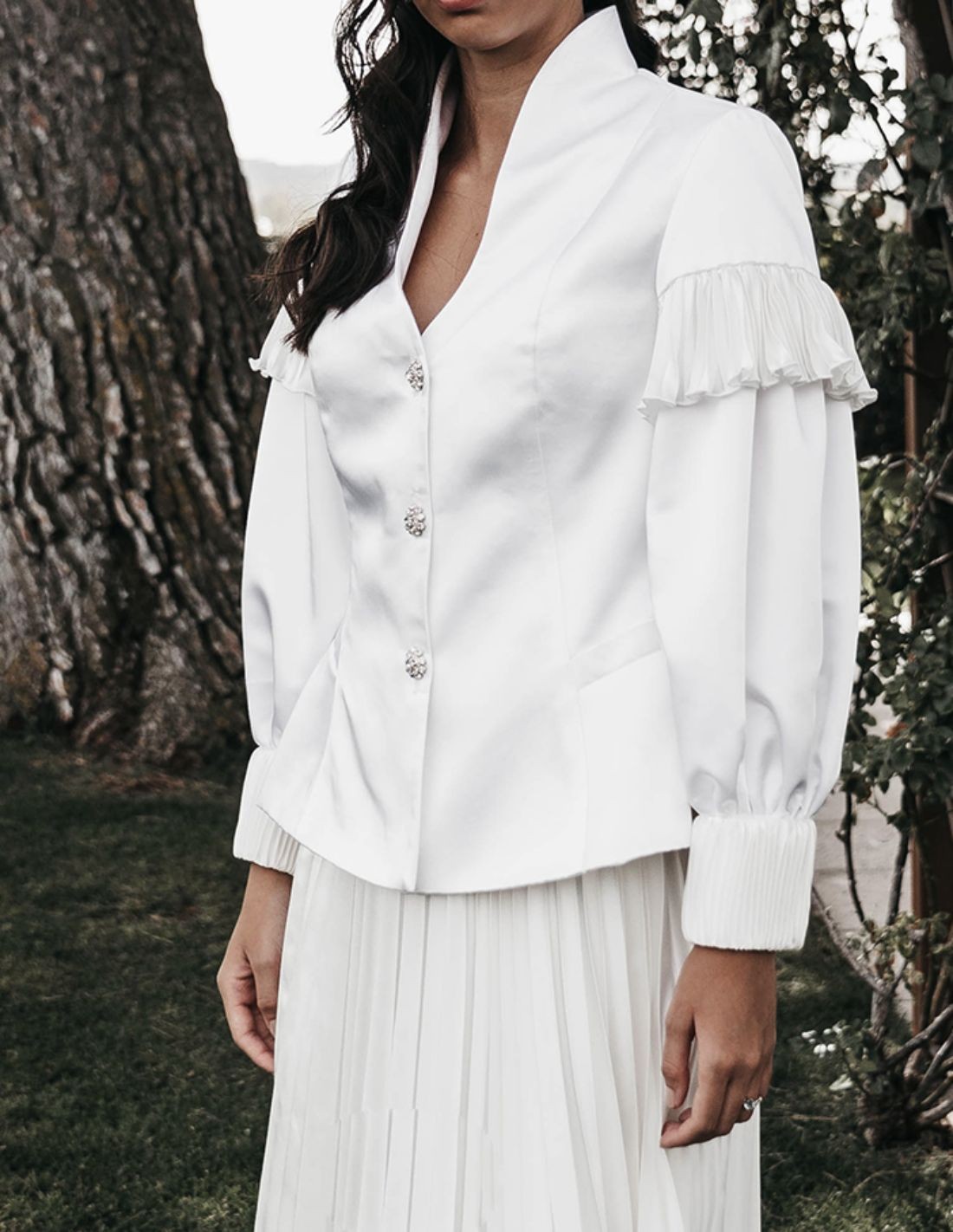 Cette Veste événementielle est confectionnée à partir d'un délicat crêpe blanc associé à de la soie plissée sur les manches. Elle présente un corsage ajusté, un décolleté en V avec une encolure de cygne, des manches longues bouffantes avec poignets et plis, et des boutons centraux en cristal.