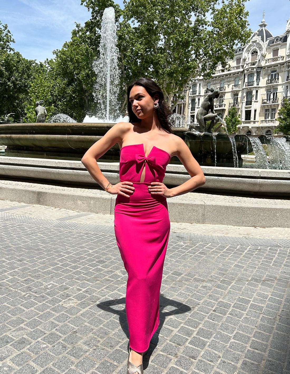 Robe longue de fête sans bretelles avec un nœud rose sur le devant