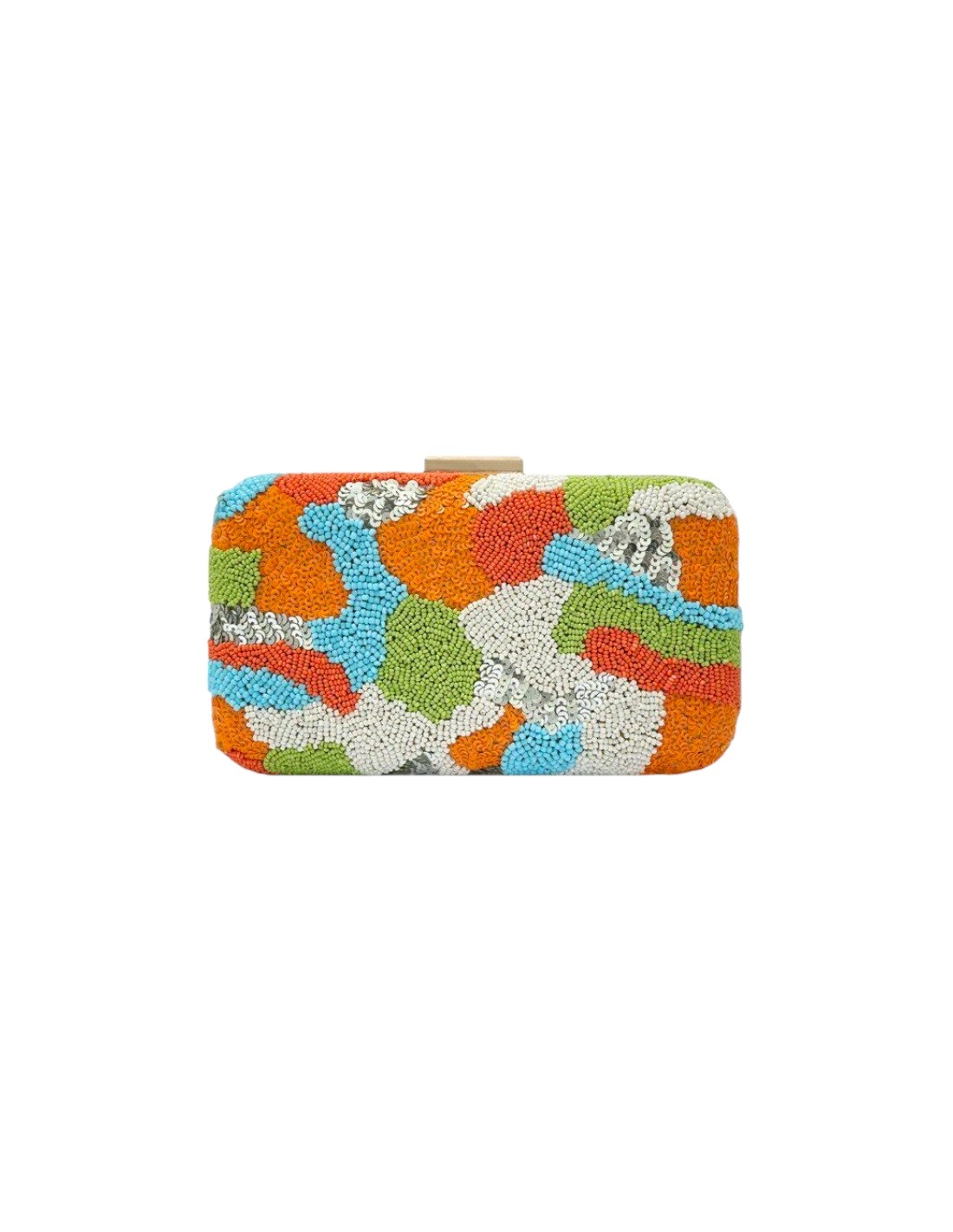 Ajoutez une touche de couleur et de sophistication à vos tenues d'invités avec cette pochette de fête brodée multicolore, un accessoire vibrant qui ne manque pas de personnalité. Les tons bleu, orange, argent et vert se combinent pour créer un design élégant qui attire le regard.
