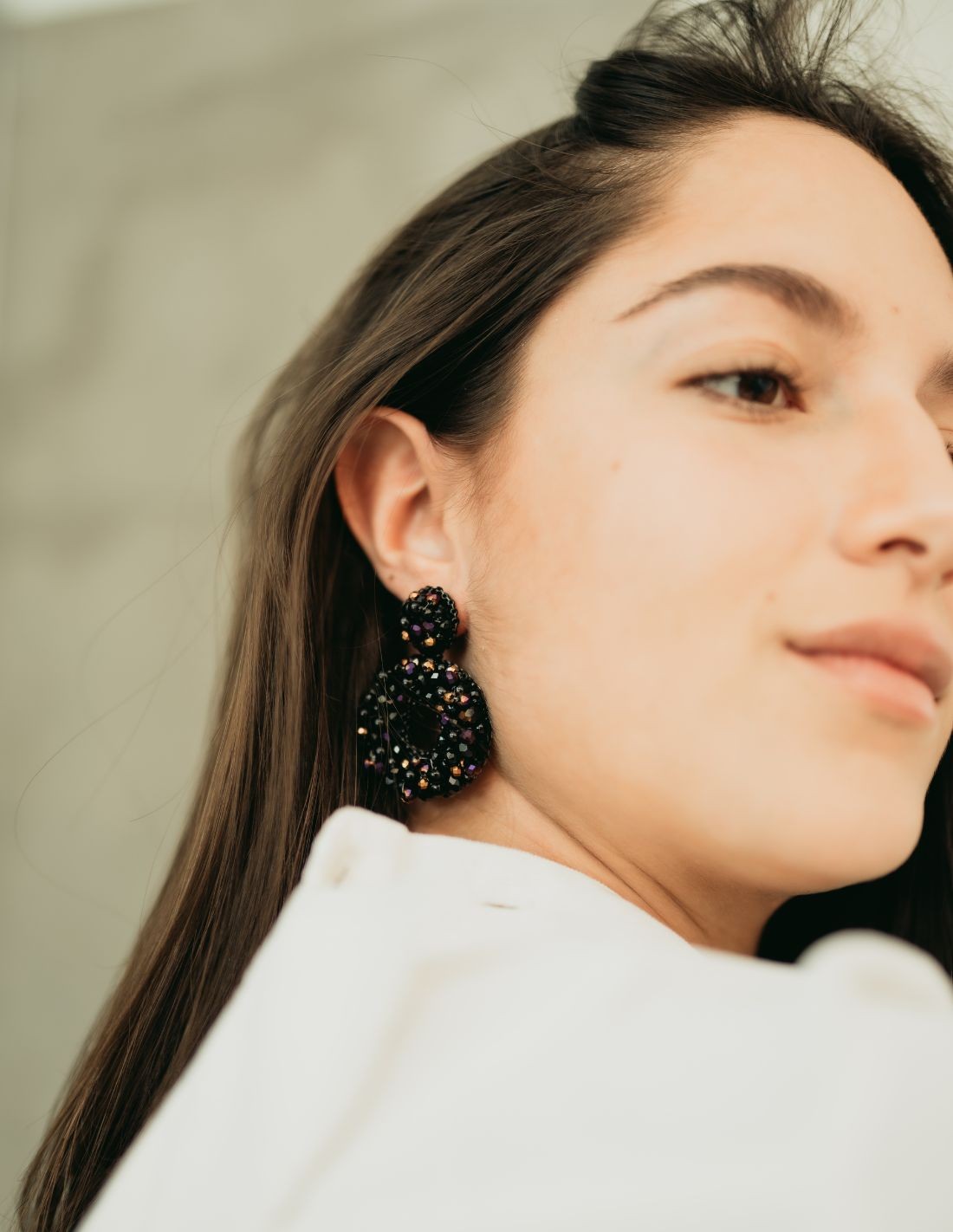 Boucle d'oreilles rondes de fête avec des cristaux et des perles pour les occasions spéciales.