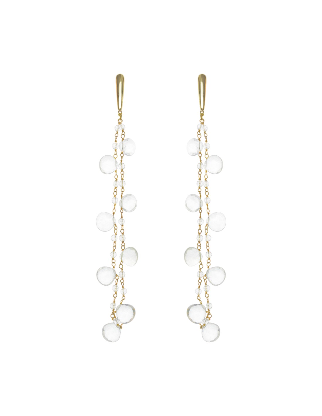 Ces longues boucles d'oreilles au design élégant et sophistiqué en plaqué or et aux cristaux légèrement tombants sont l'accessoire idéal si vous cherchez à compléter votre look avec un accessoire simple mais qui fait sensation. Fabriquées en argent sterling avec une finition plaquée or 22k. Idéal pour les invitées d'un événement et pour les mariées à la recherche d'un accessoire original.
