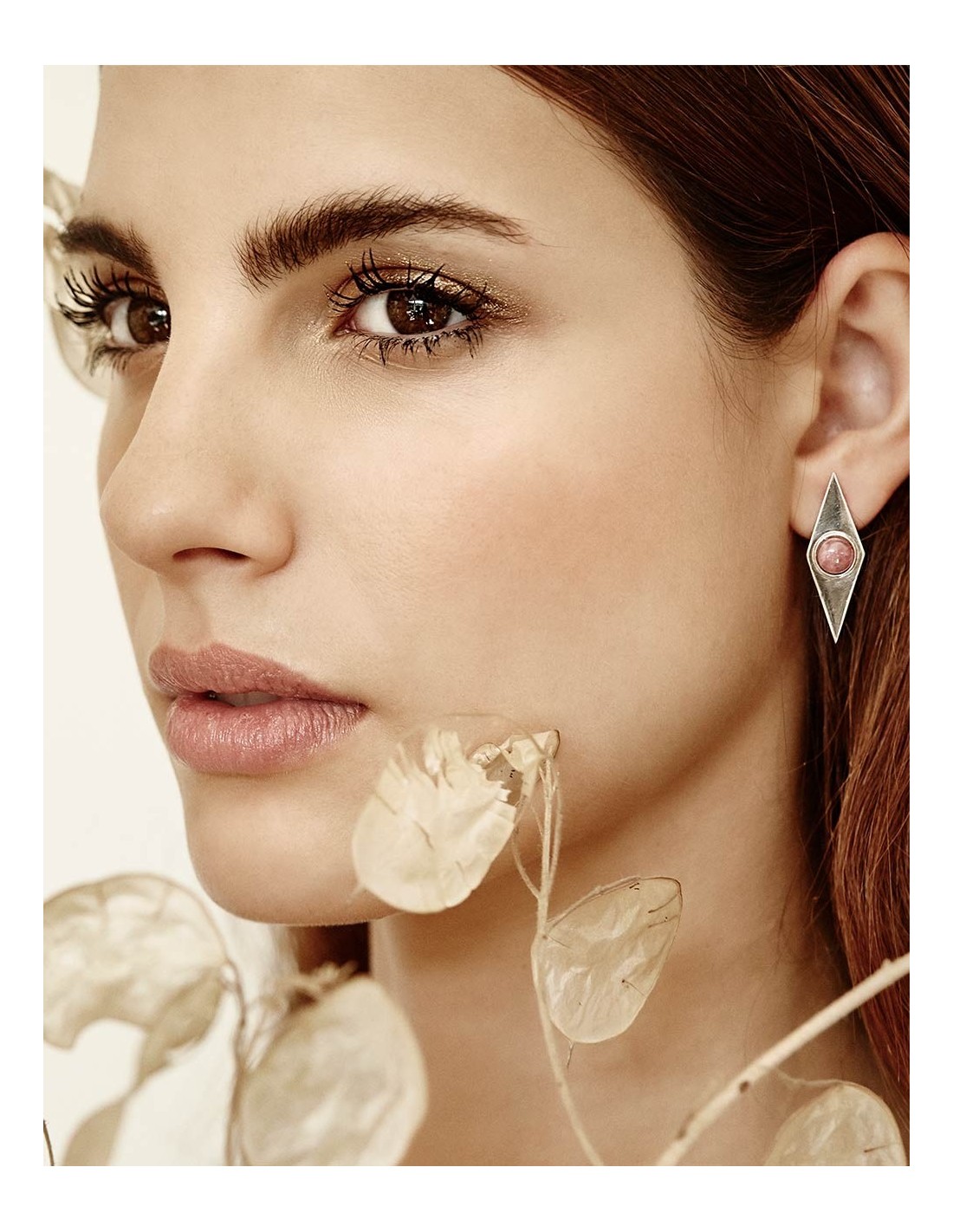 Boucle d'oreilles en argent en forme de losange avec pierre rhodochrosite par Eme Jewels chez INVITADISIMA.