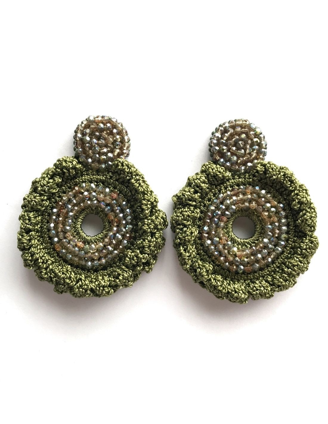 Ces boucles d'oreilles en crochet tricotées à la main sont artisanales et sophistiquées. Réalisées avec des fils de satin, elles forment un cercle délicat qui apporte mouvement et luminosité à chaque look. Au centre, des cristaux circulaires ajoutent de l'éclat et de la profondeur, créant un contraste élégant qui met en valeur la texture du tissage. Le cristal taupe renforce l'esthétique raffinée avec un détail subtil et féminin.