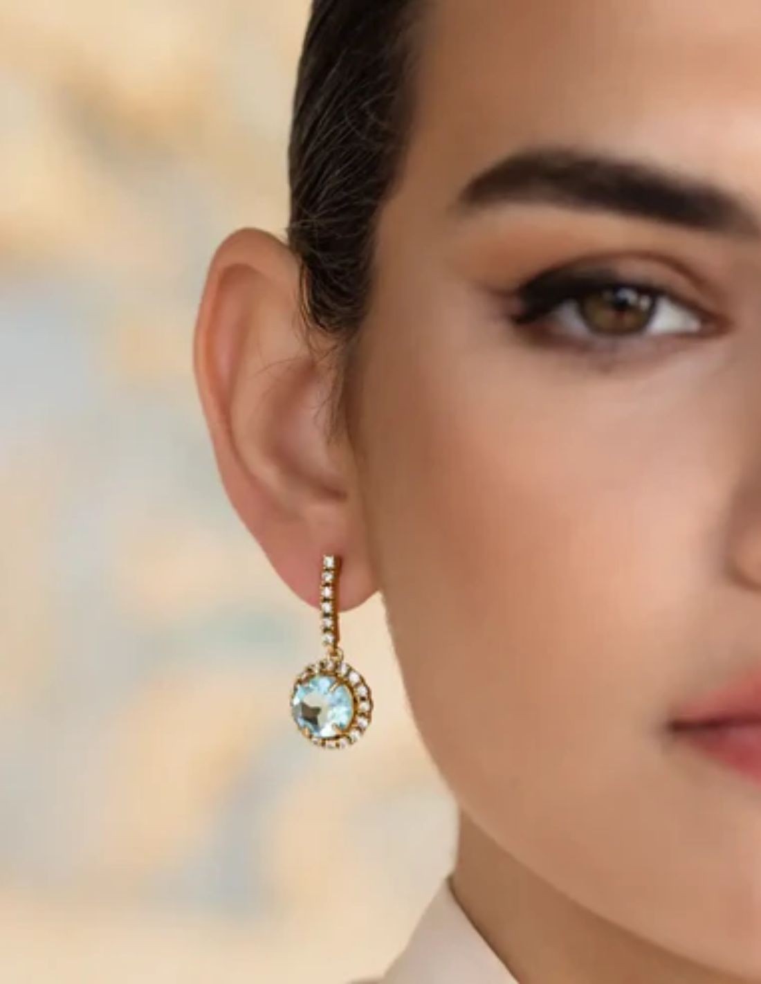 Ces boucles d'oreilles se distinguent par leur design raffiné et lumineux, centré sur une pierre facettée, qui leur confère un éclat subtil et sophistiqué. La pierre centrale est entourée d'un délicat halo de zircons sertis avec précision, qui rehausse son éclat et lui confère une finition élégante et équilibrée. Fabriquées en laiton plaqué or. Leur design intemporel en fait un choix parfait pour les événements spéciaux et pour compléter les looks de tous les jours avec une touche de distinction.