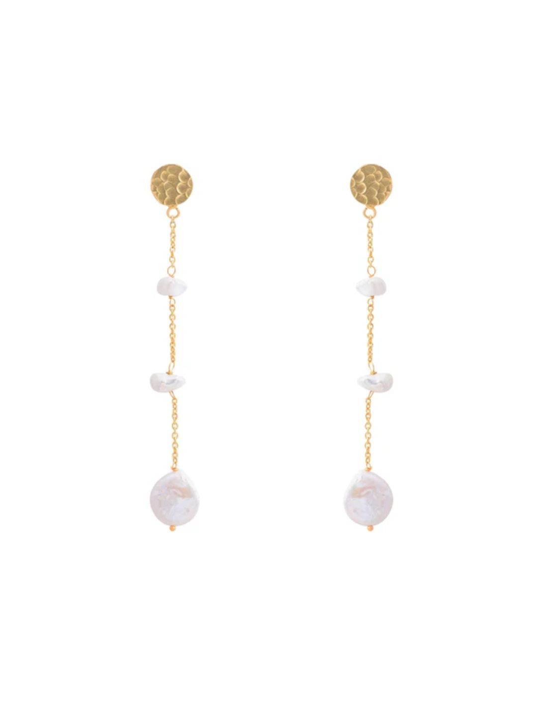 Ces boucles d'oreilles allient délicatesse et élégance moderne dans un design composé d'une fine chaîne en laiton plaqué or pour une touche sophistiquée et contemporaine, accompagnée de perles de forme irrégulière, créant ainsi une pièce équilibrée et polyvalente. Son design allongé affine la silhouette et offre un effet de légèreté, idéal pour compléter les tenues formelles et quotidiennes.