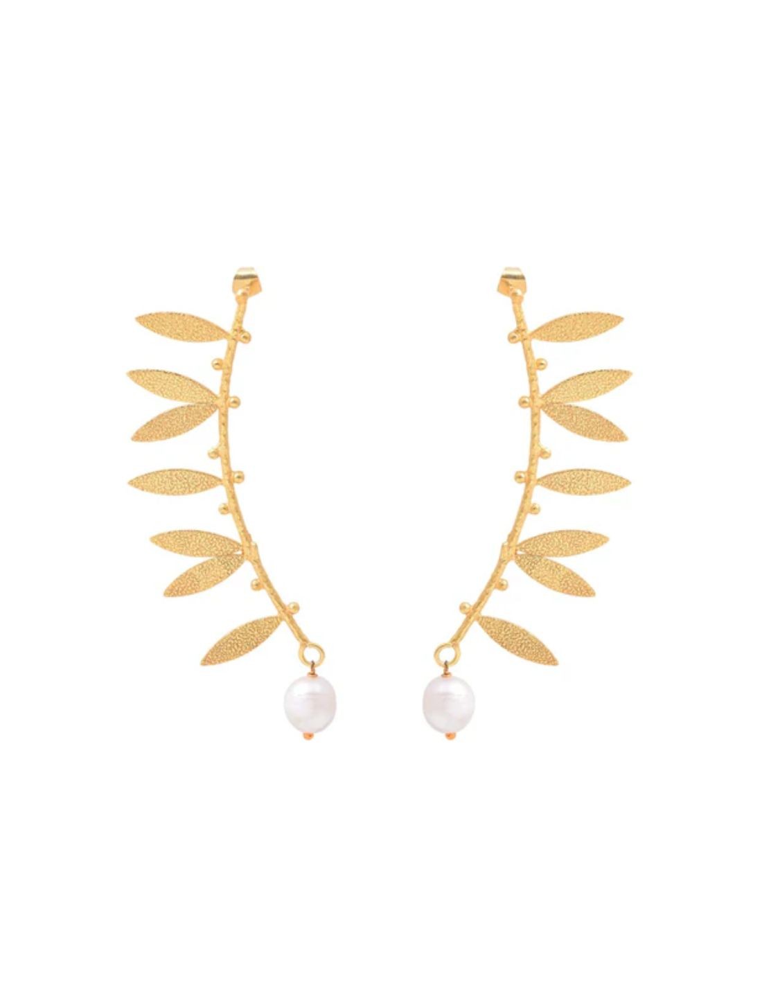 Ces boucles d'oreilles en forme de feuilles et de perles évoquent l'élégance naturelle des détails organiques combinée à la luminosité de l'or. Réalisées en laiton plaqué or, elles présentent une délicate structure incurvée d'où émergent de petites feuilles finement travaillées. Au bout de chaque boucle d'oreille, une perle pendante apporte une touche de sophistication, ajoutant de l'éclat et de la distinction à la pièce. Leur design léger et raffiné en fait l'accessoire idéal pour rehausser les looks quotidiens comme les tenues plus élégantes.