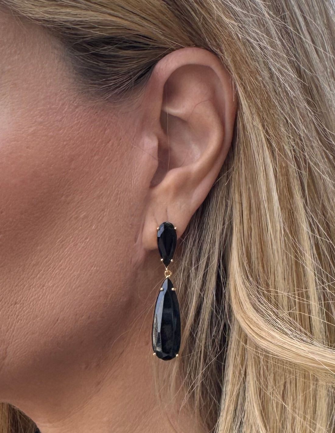 Ces élégantes boucles d'oreilles noires se distinguent par leur design intemporel, avec une petite pierre noire au sommet, d'où pend délicatement une larme noire pour une touche de sophistication. Leur finition sombre et brillante en fait l'accessoire parfait pour rehausser n'importe quel look, que ce soit pour un invité ou une occasion spéciale.