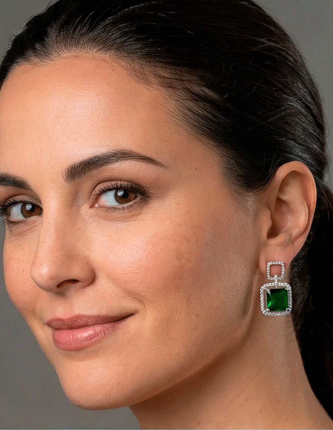 La pièce maîtresse est une pierre centrale vert émeraude en cristal de haute qualité, entourée de petits cristaux naturels qui apportent un éclat subtil et sophistiqué. Les formes carrées créent une esthétique moderne et très flatteuse, donnant structure et élégance au visage.