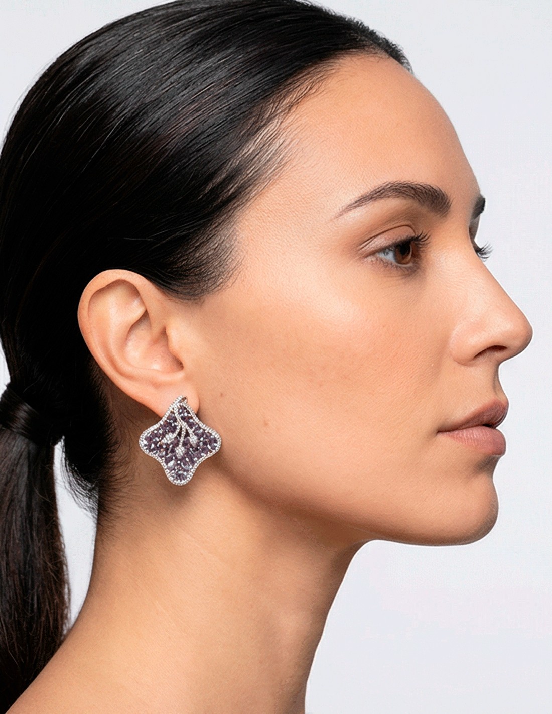 La teinte lilas, douce et sophistiquée, donne un air romantique et élégant, illuminant le visage et adoucissant les traits. Les pierres semi-précieuses reflètent la lumière de manière subtile, créant un éclat délicat qui rehausse n'importe quelle tenue sans être excessif.
