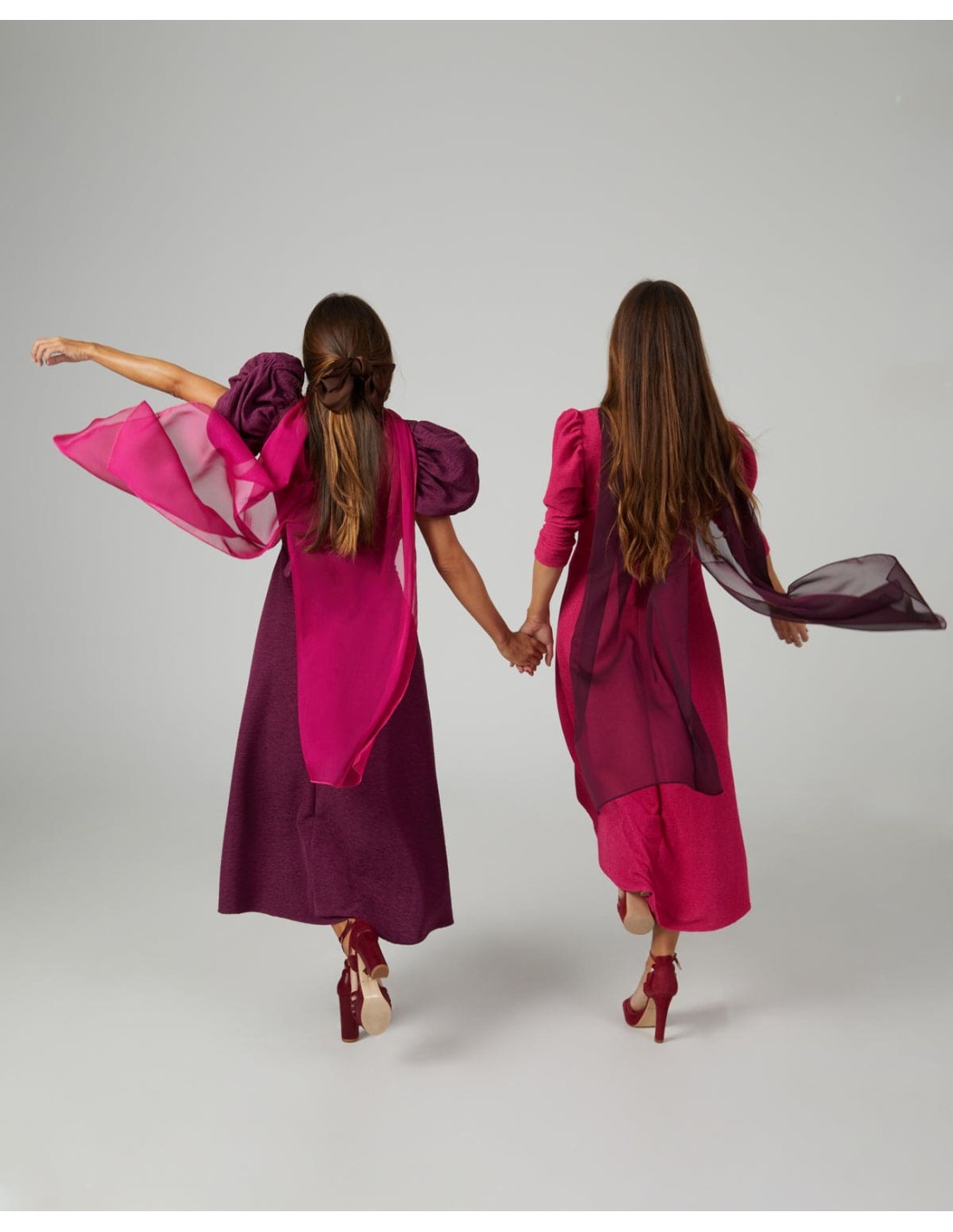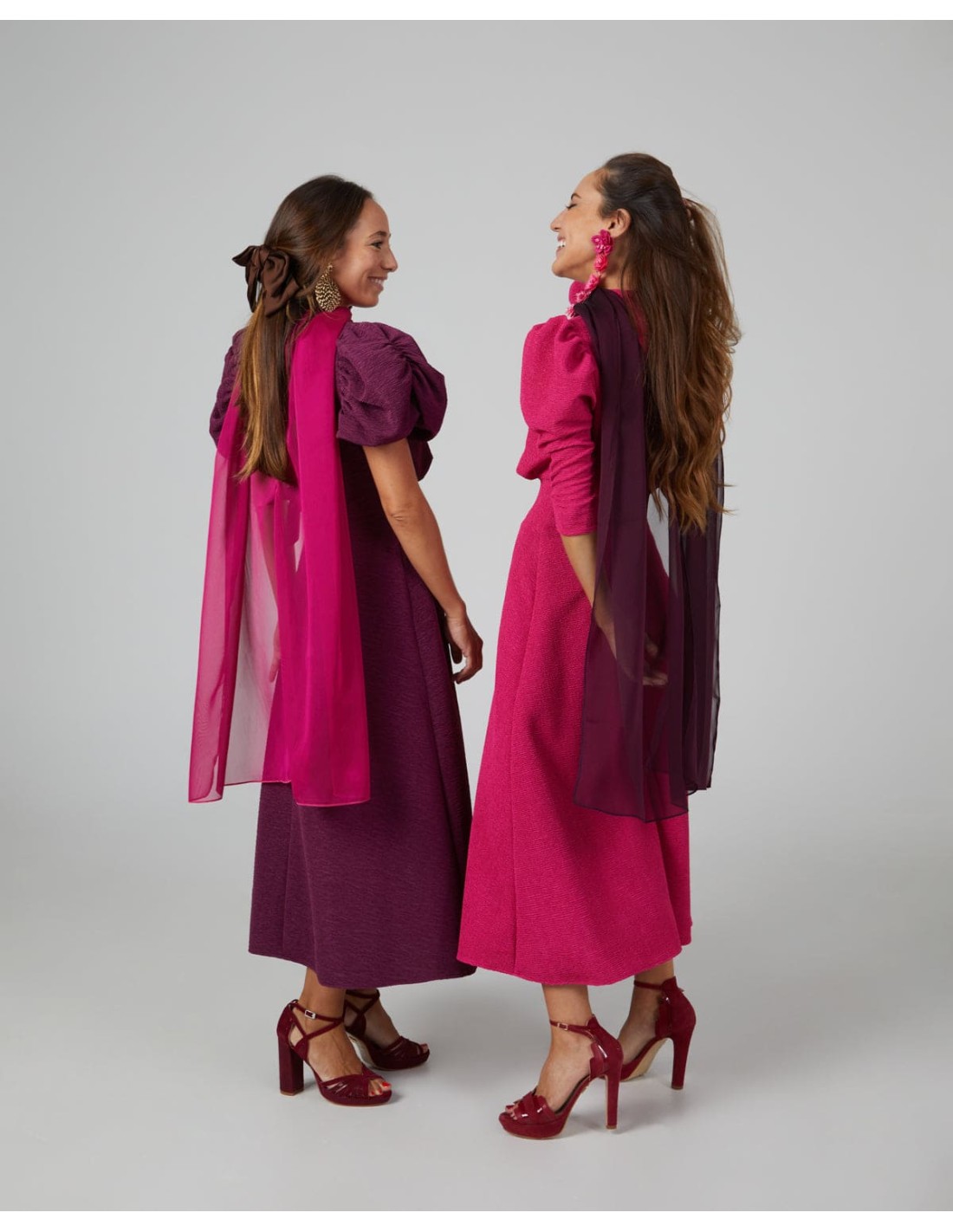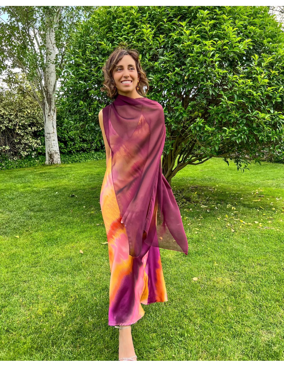 Cette cape pour invités de mariage est réalisée en élégante mousseline de soie cationique à double fil, un tissu qui se caractérise par son drapé élégant et sa texture extrêmement douce. Le point fort de cette mousseline est sa capacité à changer momentanément de teinte en fonction de la réflexion de la lumière, montrant des reflets plus sombres et plus profonds qui ajoutent une touche de dynamisme et de mystère.