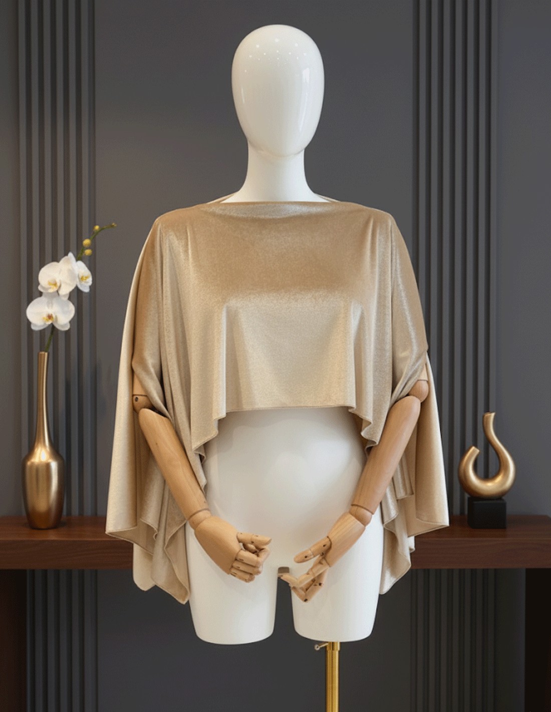 Courte cape d'invité envelours beige, au tissu fluide et légèrement brillant, conçue avec des fentes latérales qui ajoutent du mouvement et de la sophistication à chaque pas. Sa coupe moderne et polyvalente en fait le vêtement idéal pour les invités à un mariage, une fête ou un événement spécial. Associez-le à une jupe ou un pantalon à taille haute pour un look raffiné et contemporain. Une pièce intemporelle qui rehausse toutes les tenues d'une touche glamour et distinguée.
