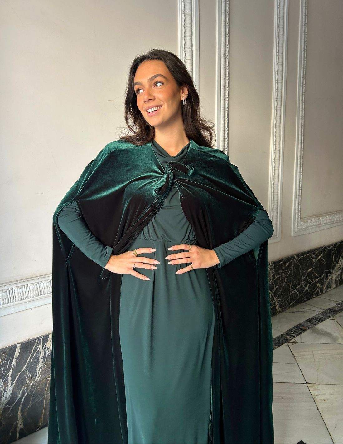 Cette longue cape d'invité fera de vous l'invitée la plus élégante de l'événement. Réalisée en velours, elle est dotée d'un nœud au niveau du cou. Elle est parfaite pour les événements d'automne et d'hiver et pour les occasions élégantes ou plus informelles. Elle vous gardera au chaud et ajoutera du style à votre look d'invitée. Il présente des fentes sur les côtés qui permettent de bouger et de se sentir à l'aise. Il sera l'accessoire parfait qui fera de vous l'invitée la plus branchée.