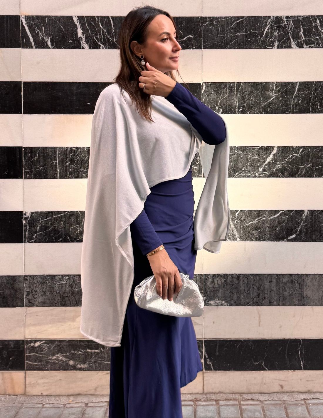 Si vous êtes à la recherche d'un accessoire spécial qui rehaussera votre look et que vous ne voudrez plus enlever, cette fine cape argentée sera votre alliée. Vous pouvez la combiner avec des centaines de looks, grâce à sa couleur et à son tissu, elle est super élégante et facile à combiner. Vous pouvez la porter pour un événement comme pour un look plus décontracté. Vous pouvez également le porter comme bon vous semble. Son tissu brillant ajoute une touche sophistiquée qui sera indispensable à votre look de fête.