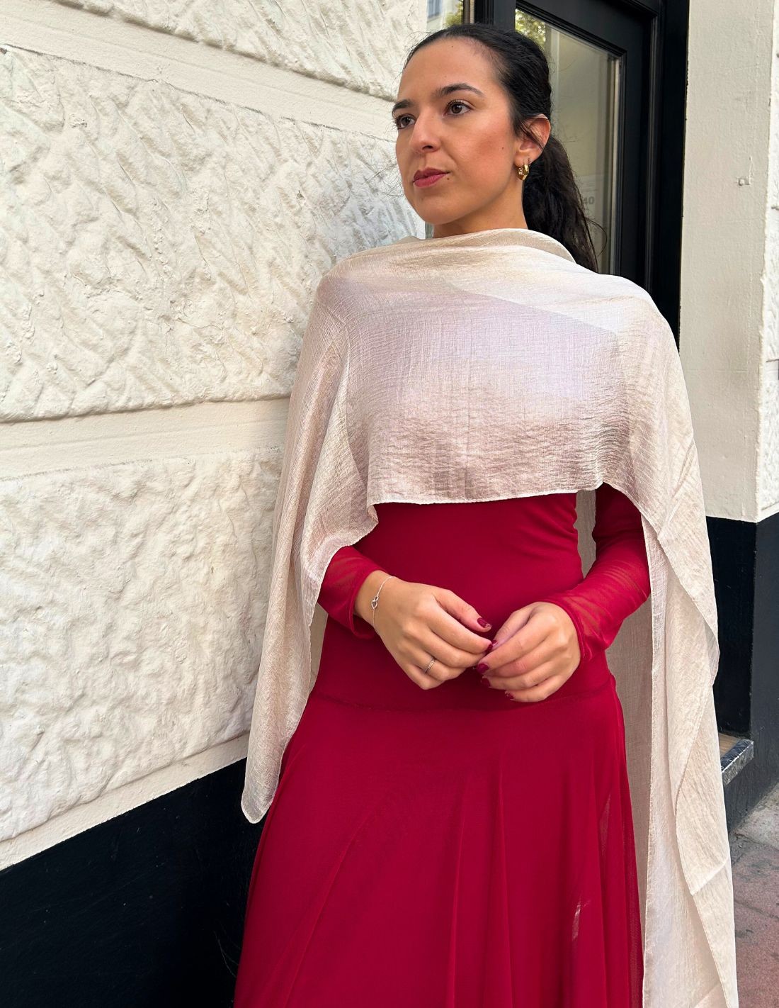 Les accessoires sont toujours la clé de tout look d'invité, ce sont eux qui feront la différence lors de votre prochain événement, comme ce châle d'invité. Un long châle en tissu texturé satiné avec des touches brillantes en or, très facile à combiner et parfait pour toutes sortes d'occasions spéciales ou même pour combiner avec des looks décontractés.