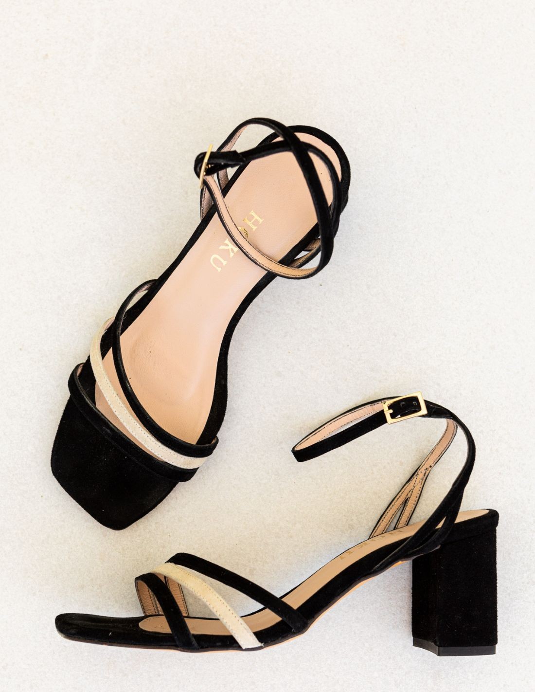 Sandale de soirée bicolore à talon carré en daim, en noir et beige, à porter lors de vos occasions les plus spéciales.