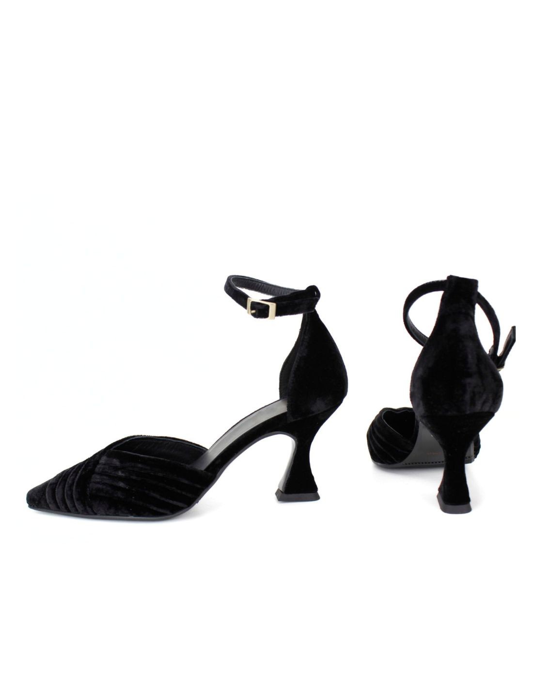 Cette élégante chaussure à talon en velours noir est idéale pour les soirées ou les événements formels. Le velours confère à la chaussure une touche de distinction et de douceur, complétée par des plis à l'avant qui ajoutent de la texture au modèle. Le bout pointu affine le pied et ajoute une silhouette féminine.