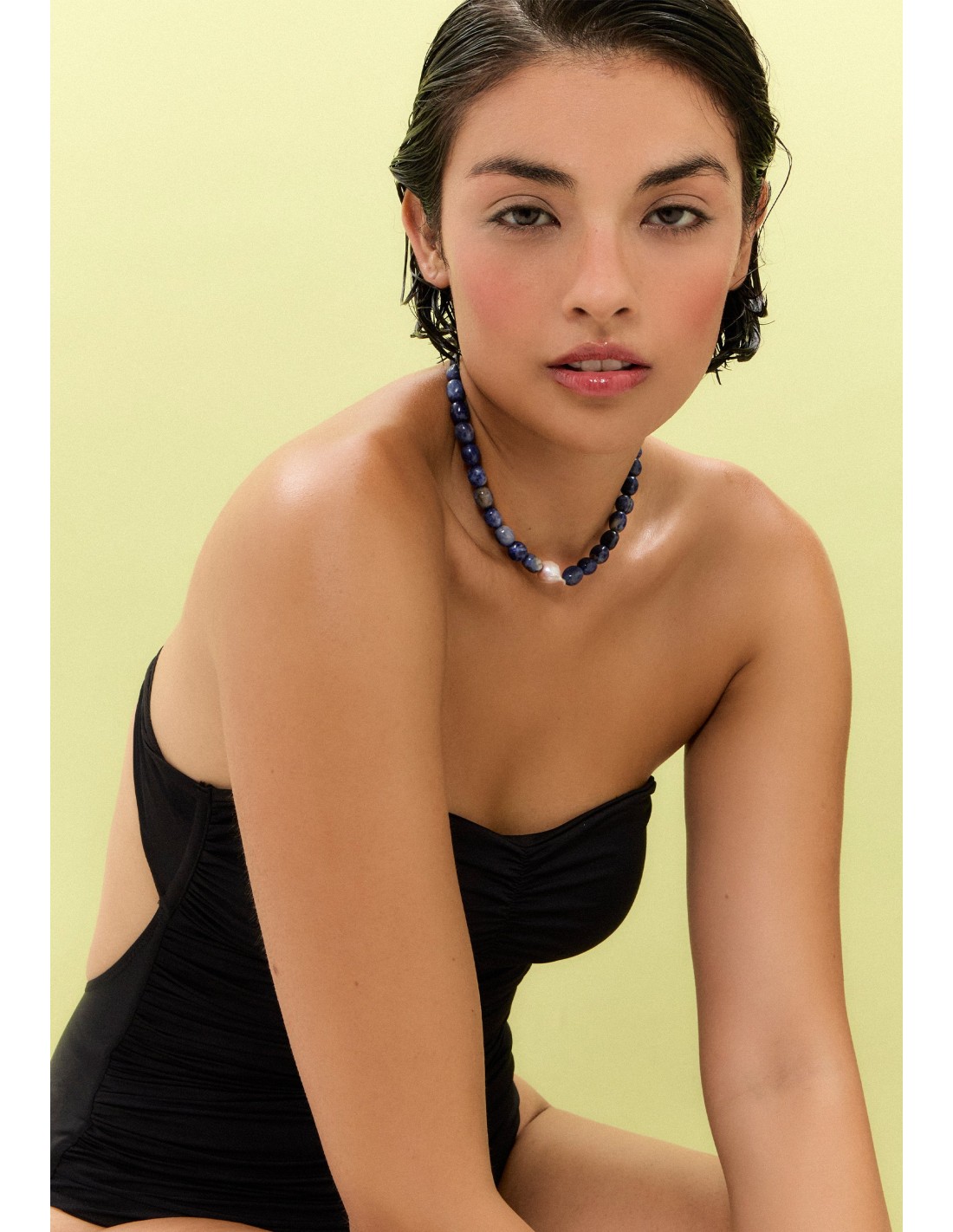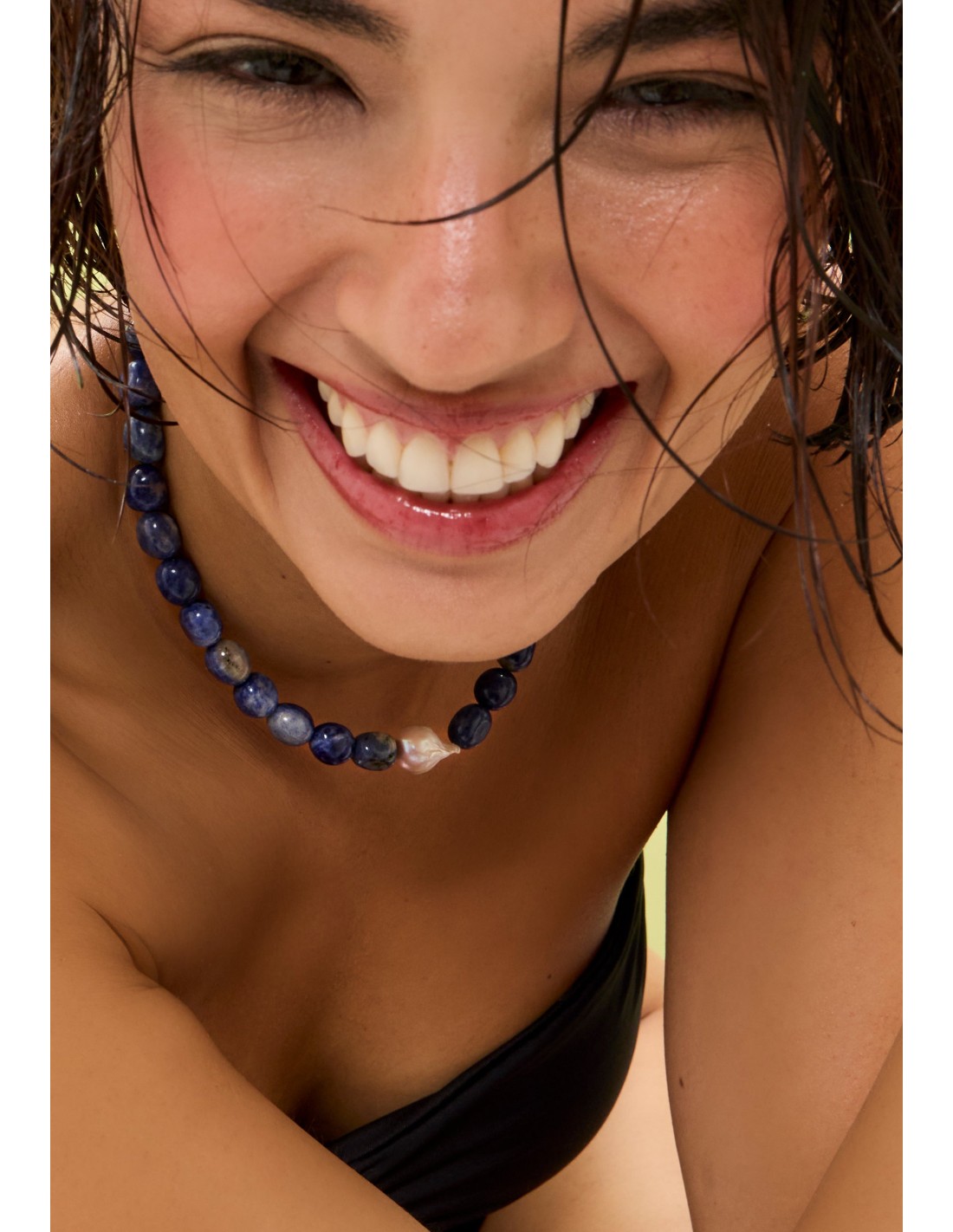 Si vous êtes à la recherche d'un accessoire qui rehaussera votre look et fera toute la différence, ce collier de pierres bleues fera l'unanimité. Un collier en pierre sodalite avec une perle baroque au centre et une finition plaquée or 22k. Idéal pour ajouter une touche de style et d'originalité à n'importe quel look.