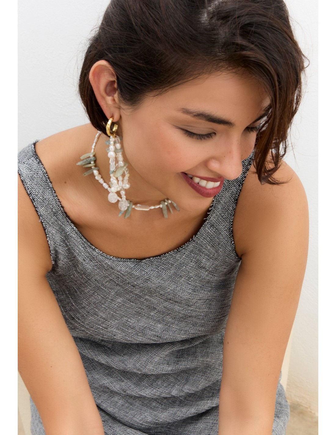 Si vous êtes à la recherche d'une parure de bijoux qui ajoutera style et élégance à votre look et vous fera briller lors de votre prochain événement, ce collier de perles est l'accessoire idéal. Un collier composé de perles baroques avec une alternance de pierres semi-précieuses aigue-marine et une finition plaquée or 22k. Idéal pour compléter votre look lors d'un événement, avec les boucles d'oreilles assorties qui accompagnent l'ensemble.