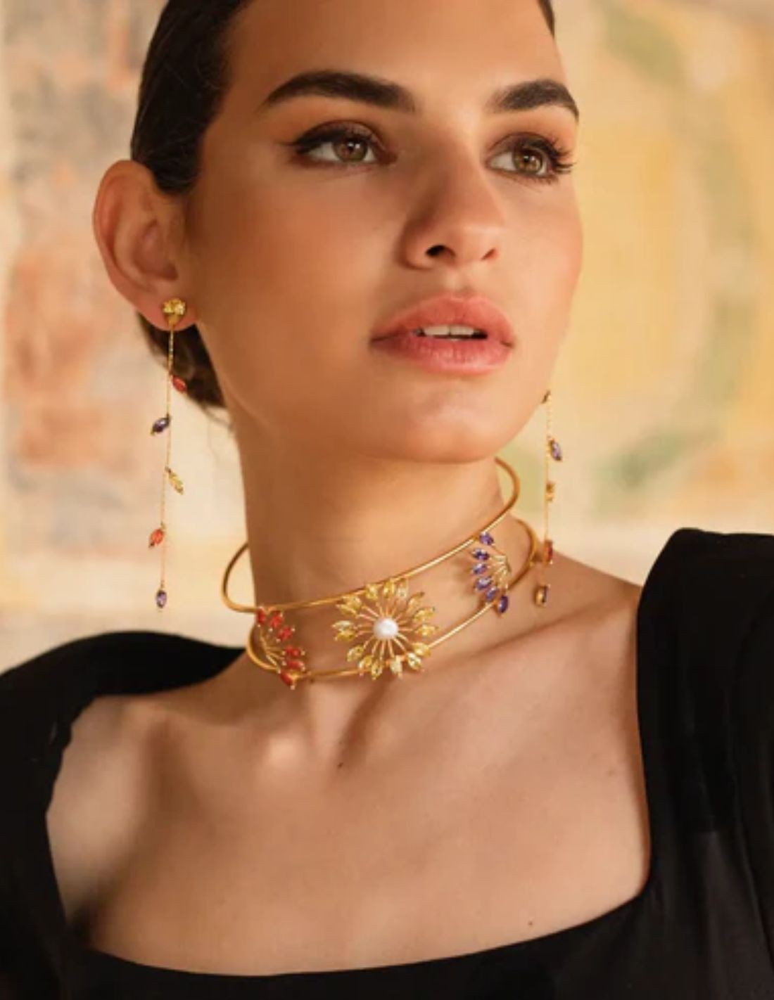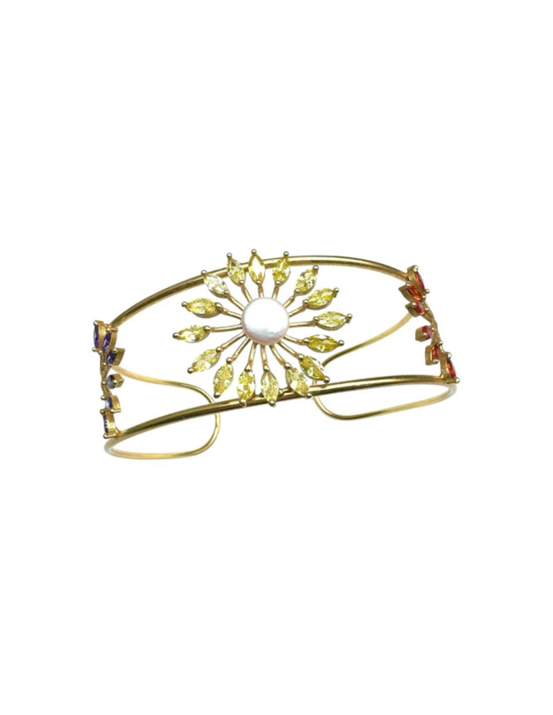 Que vous souhaitiez rehausser un look simple ou un événement spécial, ce tour de cou peut être le choix idéal. Doté d'une double structure rigide en laiton plaqué or avec une ouverture entre les deux parties, ce tour de cou est orné d'étoiles composées de pierres de zirconium de couleur violette, jaune, orange et blanche, apportant une touche de lumière et de style au visage.