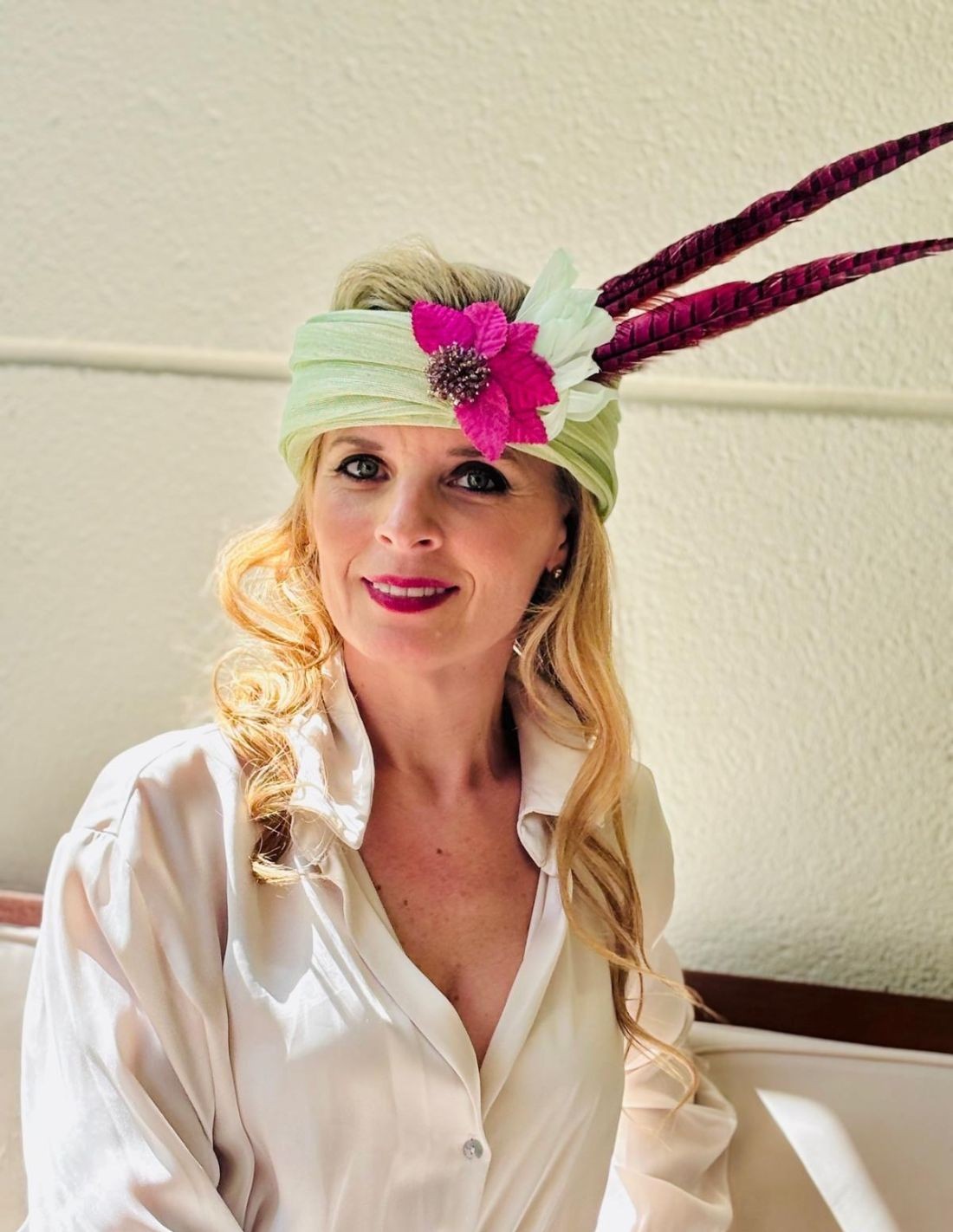 Turban en sinamay de soie tilleul et fuchsia pour les mariages du matin