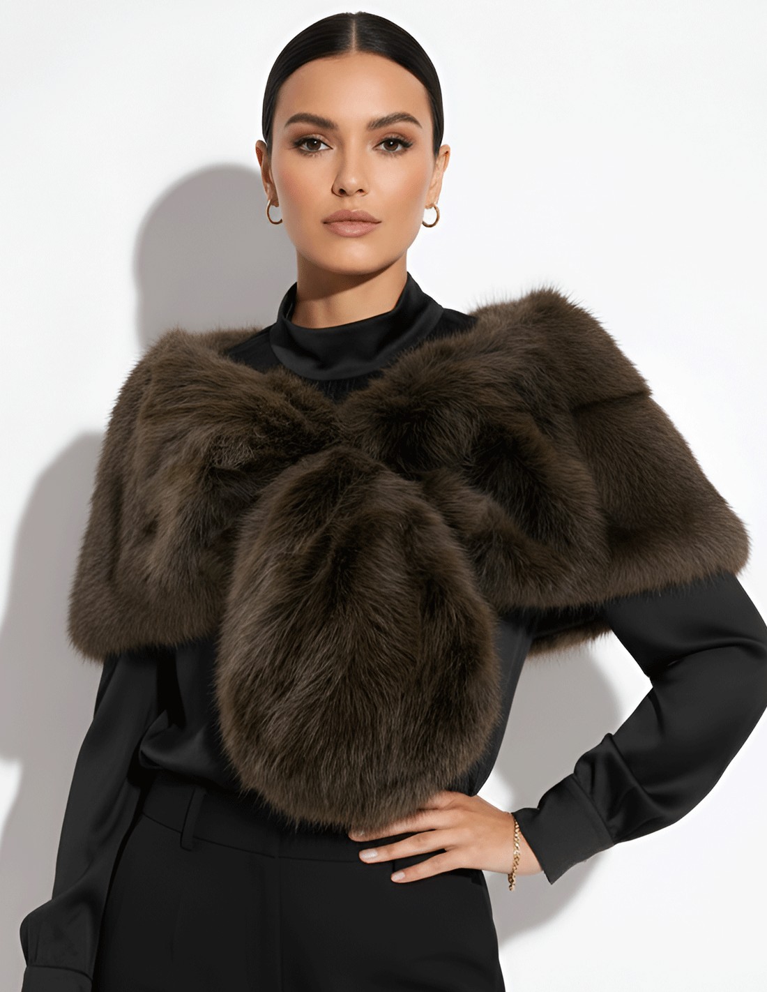 Étole d'invité brune en fourrure courte: le vêtement idéal pour les mariages, les événements et les célébrations spéciales. Son élégant design marron s'accorde avec toutes les tenues de fête, apportant une touche intemporelle et sophistiquée.