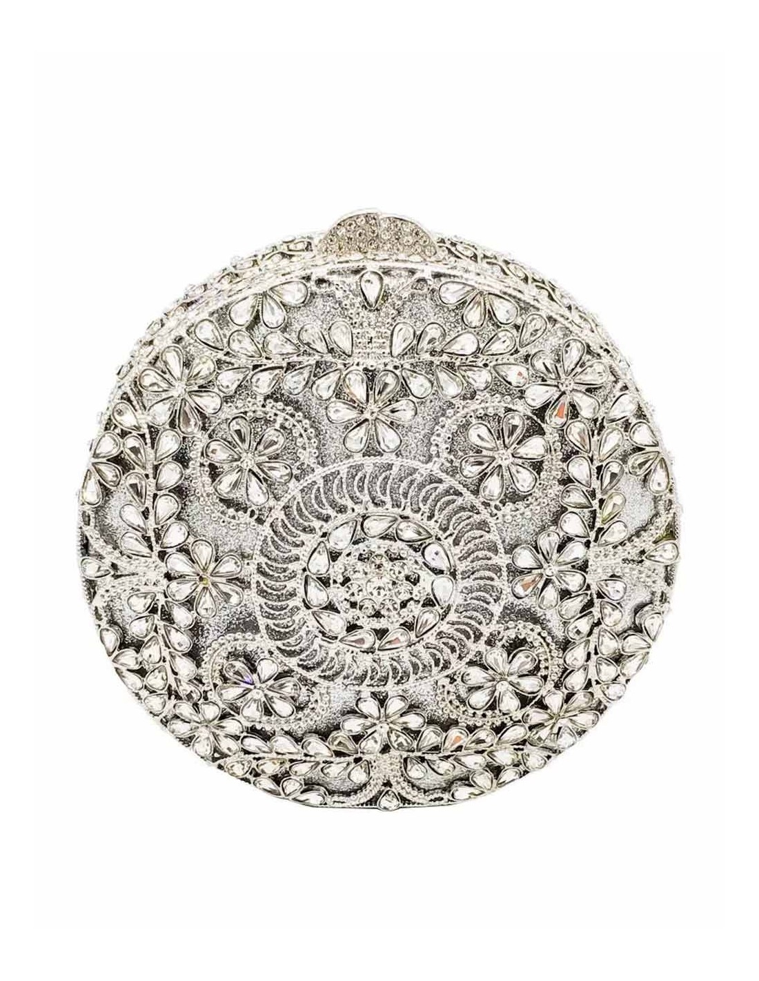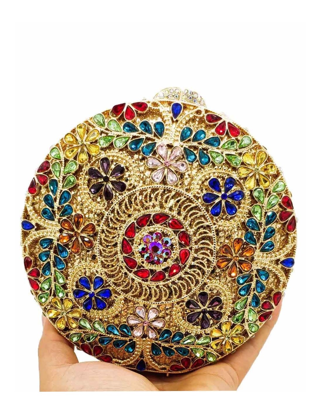 Sac de fête circulaire en métal avec décoration florale et cristaux Swarovski. Fabriquée à la main une à une, cette superbe pièce est une véritable œuvre d'art.