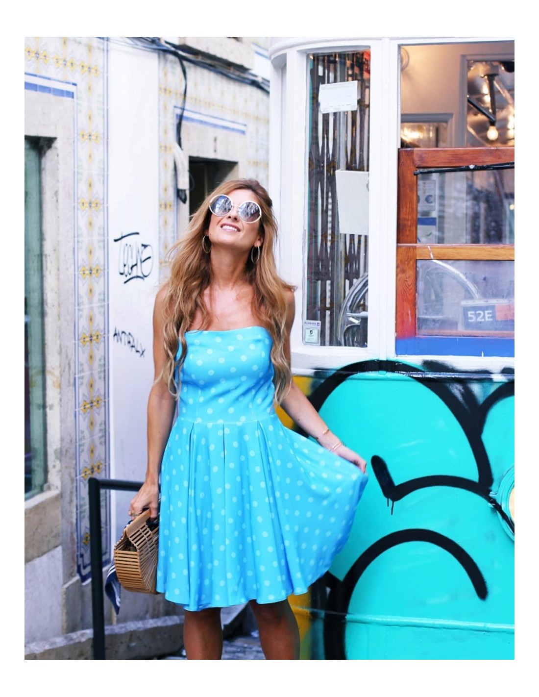 Un modèle fait de pois bleus et blancs, avec une coupe bustier et une jupe à volants des plus jeunes et des plus flatteuses.
