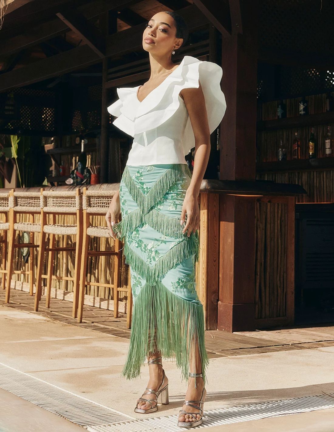 Jupe midi Adela en aigue-marine avec broderie florale ivoire et franges décoratives en zigzag.