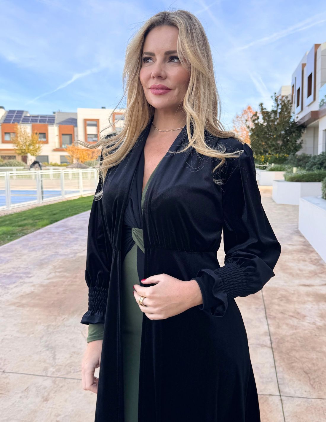Le kimono d'invité en velours noir est une pièce au style impeccable, conçue pour rehausser n'importe quel look. Sa coupe empire et sa coupe droite lui confèrent une silhouette flatteuse et élégante, tandis que ses manches élastiquées au poignet lui donnent une allure à la fois sophistiquée et confortable.