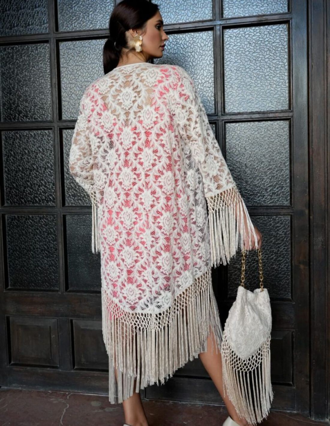 Délicat et féminin kimono en dentelle florale, idéal pour remplacer le châle flamenco ou pour compléter le look des invités.