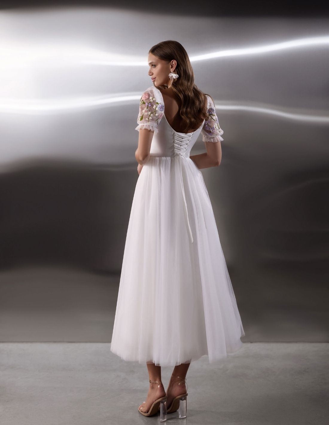 Robe de fête midi en tulle blanc avec corsage brodé floral pour les mariées civiles ou les secondes robes.