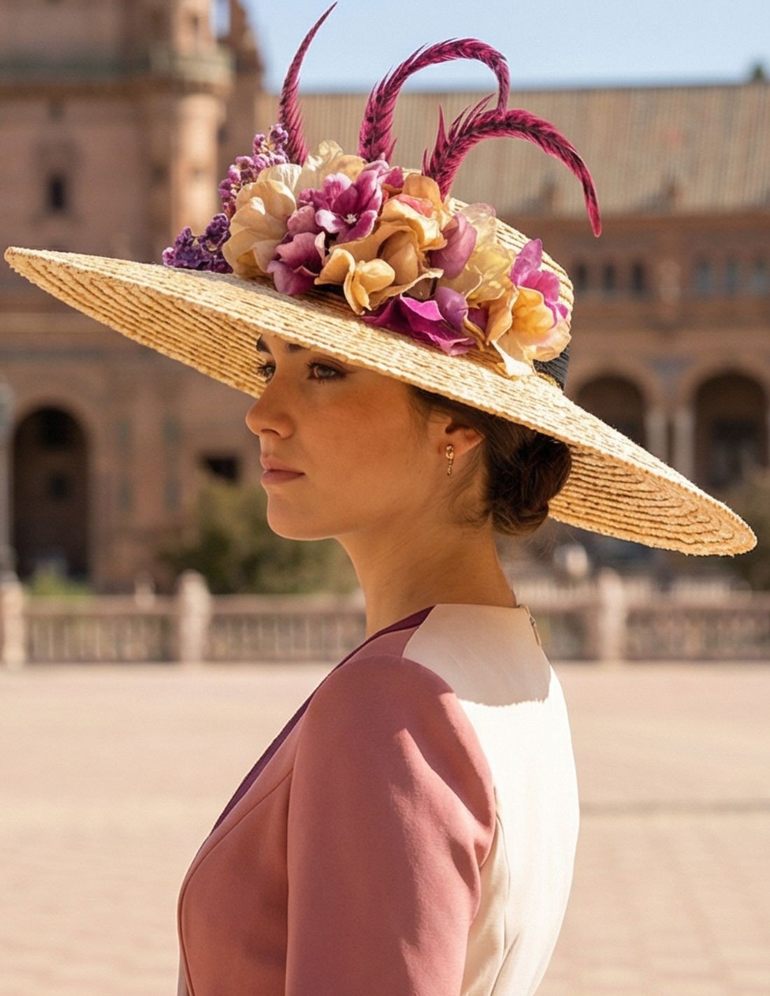 La pamela en raphia avec des détails floraux et des plumes de couleur bougainvillée est l'accessoire parfait pour les invités qui recherchent un look élégant et sophistiqué avec de la personnalité. Sa base en raphia naturel lui confère légèreté et fraîcheur, ce qui en fait un choix idéal pour les événements de jour et les célébrations en plein air.