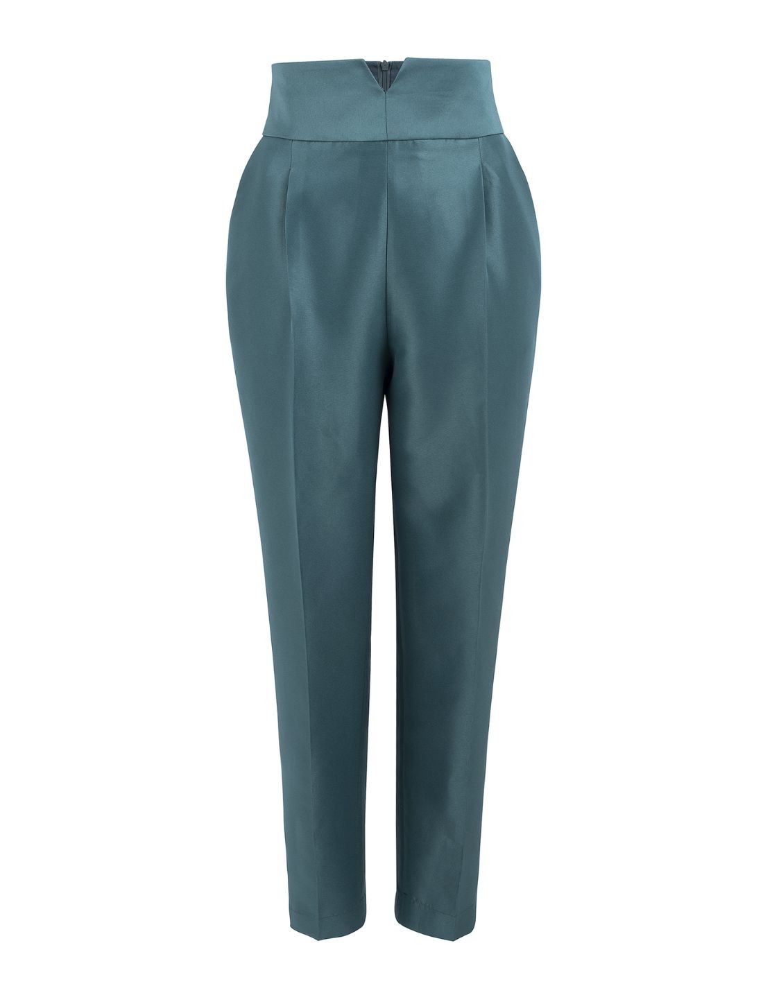 Pantalon idéal pour les invités en taffetas vert émeraude. Il présente une coupe droite avec pinces, des poches et une large ceinture avec un motif grimaçant sur le devant. Il se ferme au dos par une fermeture éclair invisible.