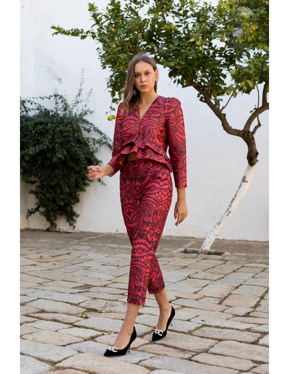 Ce pantalon droit pour invitées avec un imprimé exclusif est disponible dans les couleurs de saison, rouge Scarlet Smile et bordeaux Maroon. Ce pantalon se distingue par son style sophistiqué et moderne, idéal pour rehausser n'importe quel look d'une touche d'élégance et d'originalité.