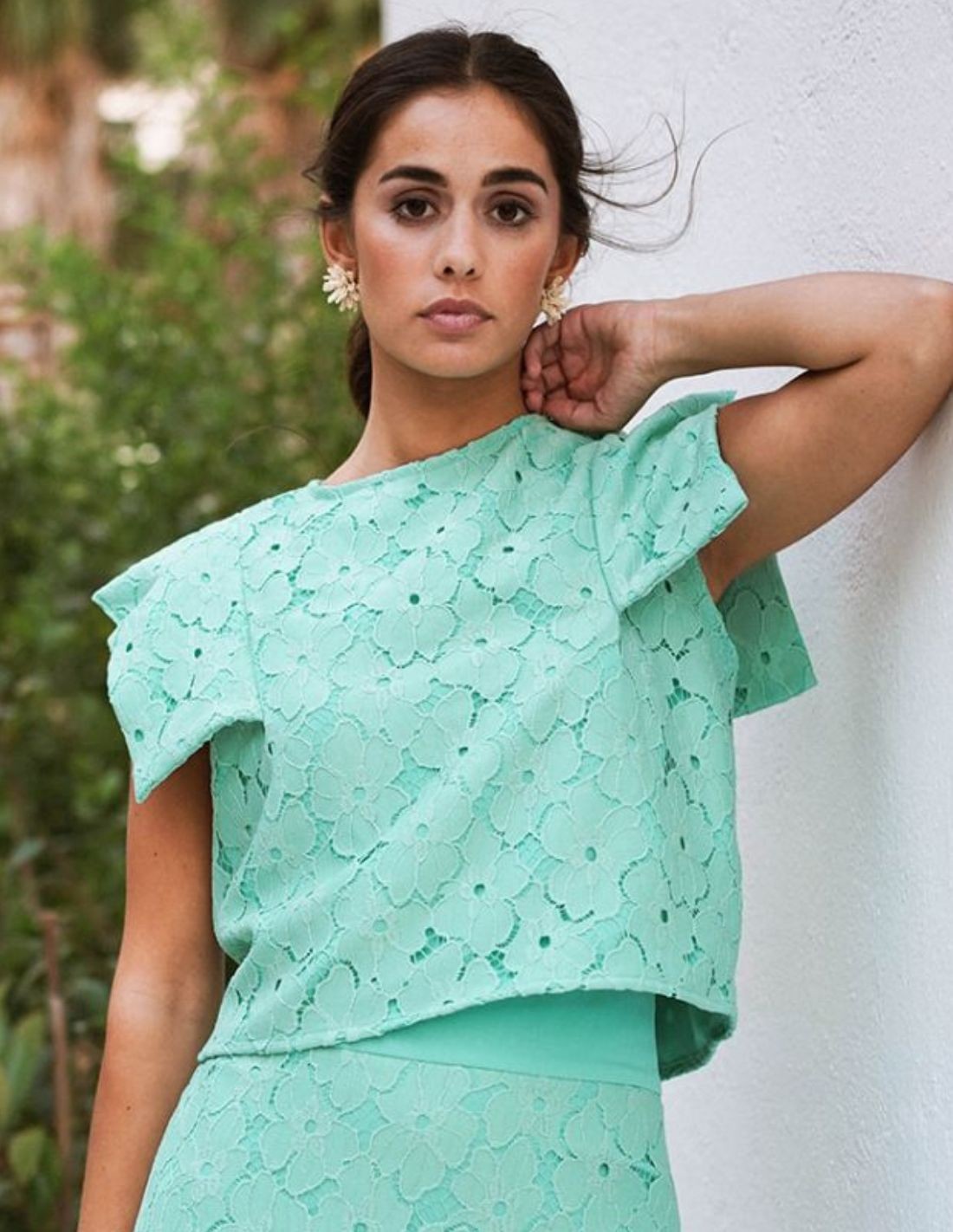 Le col en V des manches apporte une touche originale et flatteuse, tandis que la dentelle délicate rehausse la féminité de la tenue. Associez-la à la jupe assortie pour un look coordonné qui ne passera pas inaperçu. Conçu et fabriqué entièrement en Espagne, ce top est synonyme de qualité, d'exclusivité et de style intemporel.