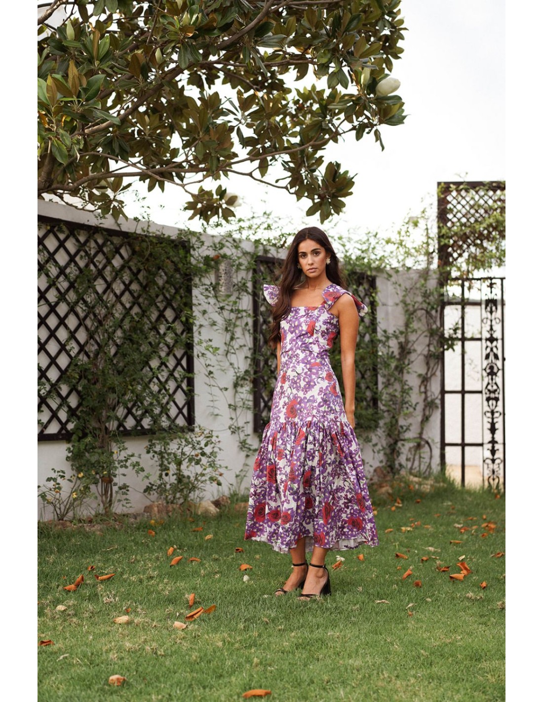 Ajoutez une touche de fraîcheur et de féminité à votre garde-robe avec cette magnifique jupe midi à imprimé floral dans les tons violet et rouge. Le volant à l'ourlet apporte du mouvement et une touche romantique, idéale pour les journées ensoleillées ou vos projets d'été.