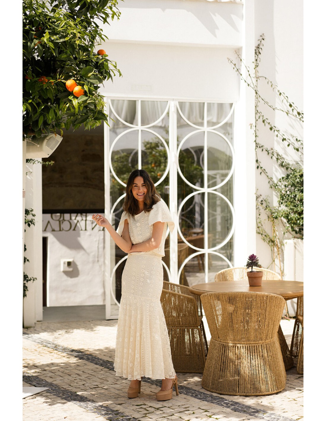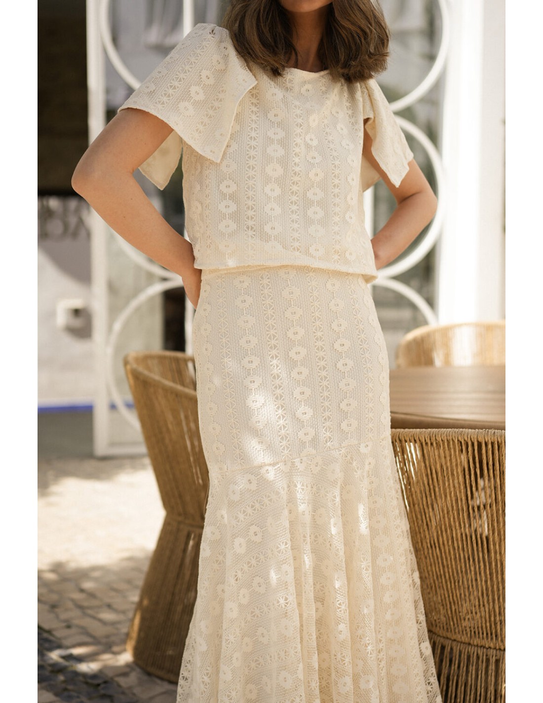 Polyvalente et sophistiquée, cette pièce peut être associée à son top de soirée ivoire, dans sa version classique à manches courtes ou à manches volantées, pour un ensemble élégant et frais. Parfait pour les événements printemps/été, les célébrations en plein air ou les tenues plus romantiques avec une touche bohème.