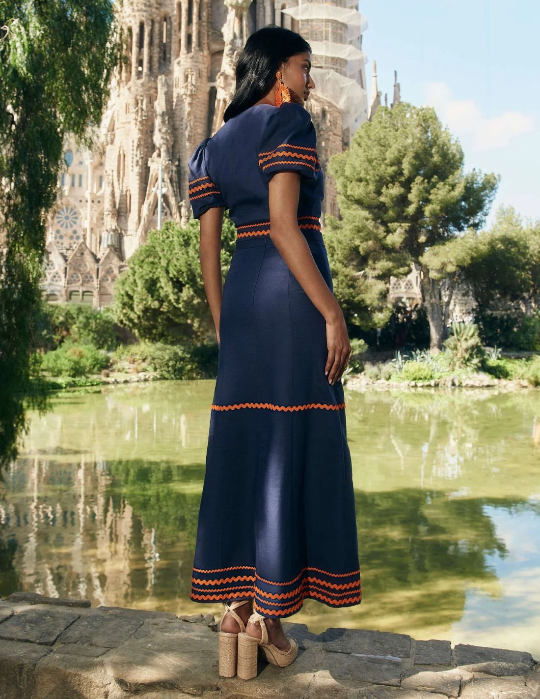 Falda midi de fiesta azul marino con caída fluida
