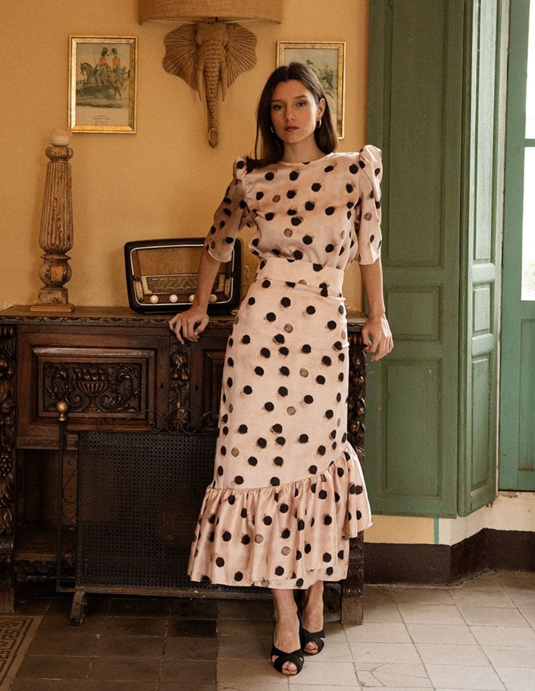 Cette jupe midi deviendra la star de votre garde-robe. Réalisée avec un imprimé à pois et un ourlet à volants, avec un tissu fluide et élégant. Si vous l'associez au top assorti, vous obtiendrez une tenue idéale pour les événements et les occasions spéciales. Essayez de les combiner séparément, et vous pourrez également la porter pour des occasions plus informelles et décontractées. Vous tomberez amoureuse de ce vêtement intemporel et sophistiqué.